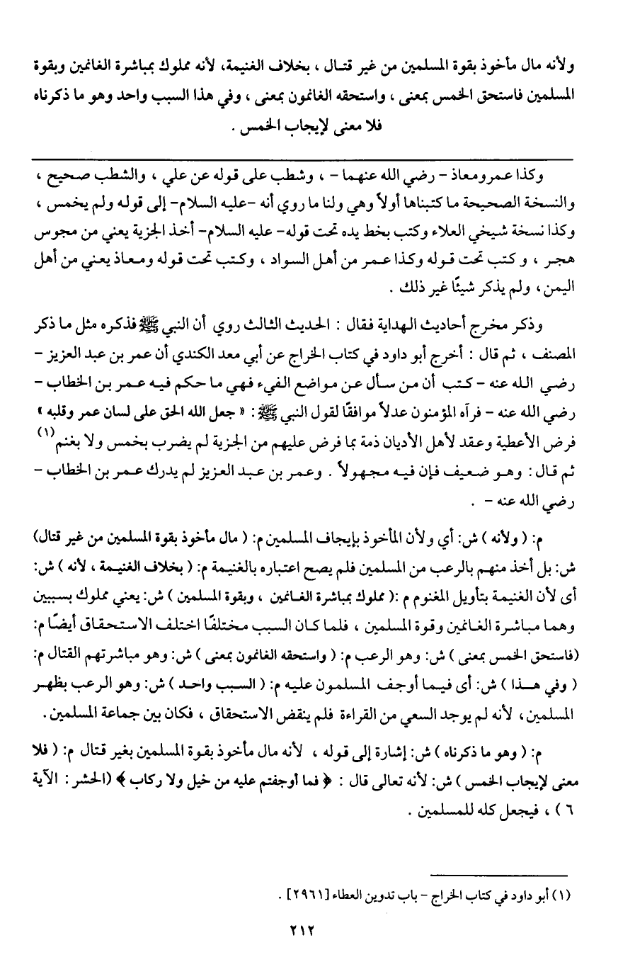م: (وهو ما ذكرناه) ش: إشارة إلى قوله: لأنه مال مأخوذ بقوة المسلمين بغير قتال م: (فلا معنى لإيجاب الخمس) ش: لأنه تعالى قال: {فَمَا أَوْجَفْتُمْ عَلَيْهِ مِنْ خَيْلٍ وَلَا رِكَابٍ} [الحشر: 6] (الحشر: الآية 6) ، فيجعل كله للمسلمين.