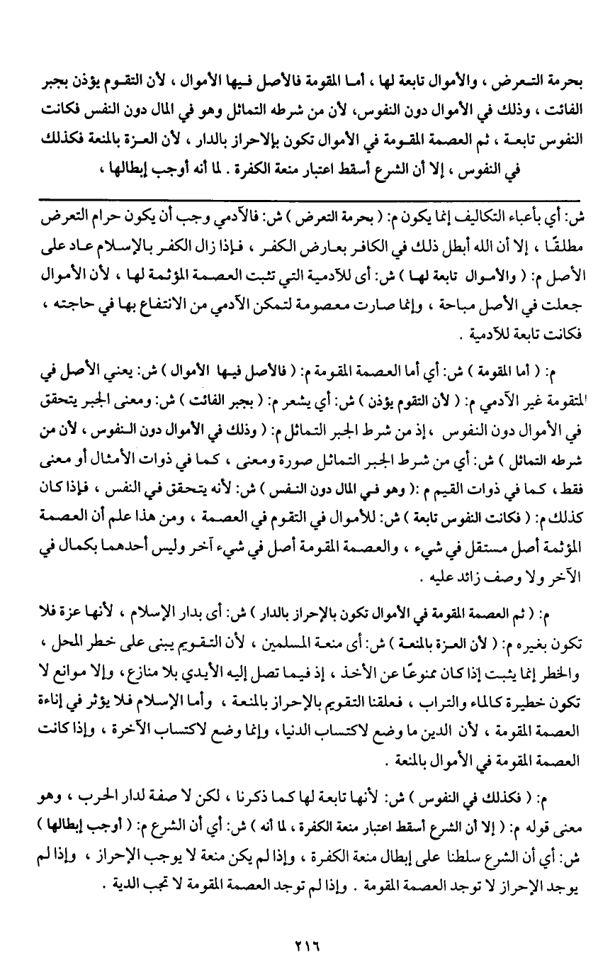 بحرمة التعرض، والأموال تابعة لها، أما المقومة فالأصل فيها الأموال، لأن التقوم يؤذن بجبر الفائت، وذلك في الأموال دون النفوس، لأن من شرطه التماثل وهو في المال دون النفس فكانت النفوس تابعة،