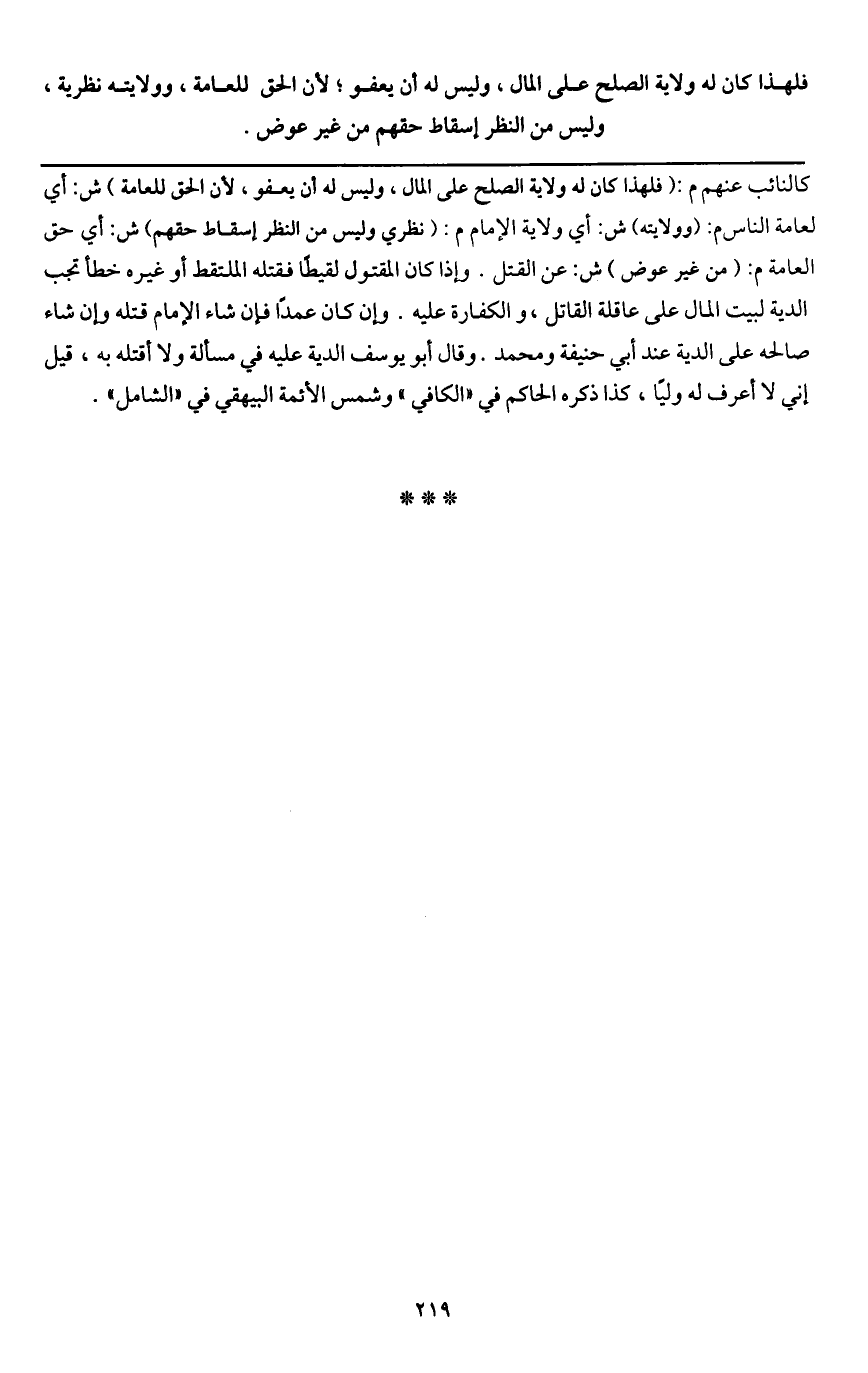 فلهذا كان له ولاية الصلح على المال، وليس له أن يعفو؛ لأن الحق للعامة، وولايته نظرية، وليس من النظر إسقاط حقهم من غير عوض.