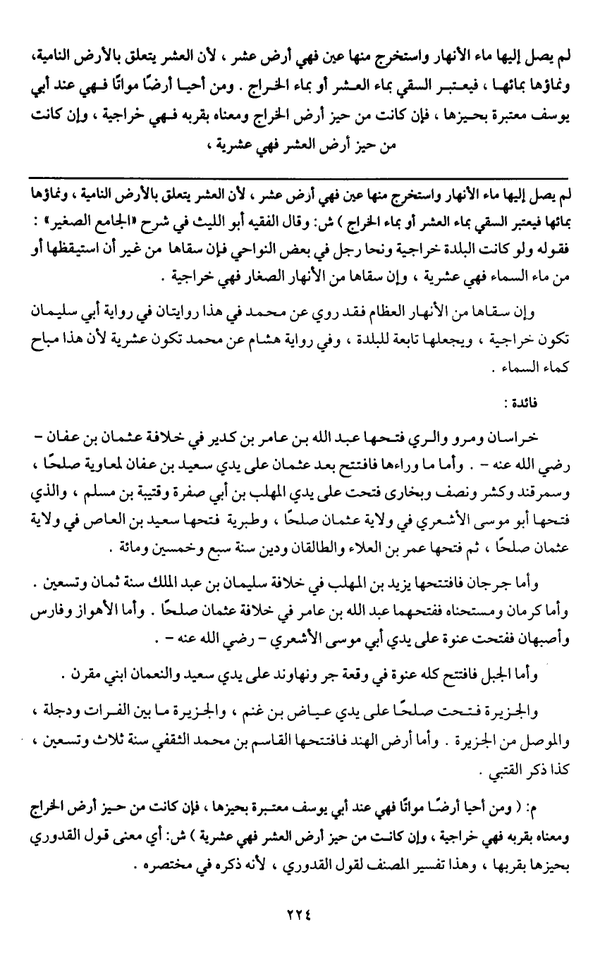 ـــــــــــــــــــــــــــــQلم يصل إليها ماء الأنهار واستخرج منها عين فهي أرض عشر، لأن العشر يتعلق بالأرض النامية، ونماؤها بمائها فيعتبر السقي بماء العشر أو بماء الخراج) ش: وقال الفقيه أبو الليث في شرح " الجامع الصغير " فقوله: ولو كانت البلدة خراجية ونحا رجل في بعض النواحي، فإن سقاها من غير أن استيقظها أو من ماء السماء فهي عشرية، وإن سقاها من الأنهار الصغار فهي خراجية.