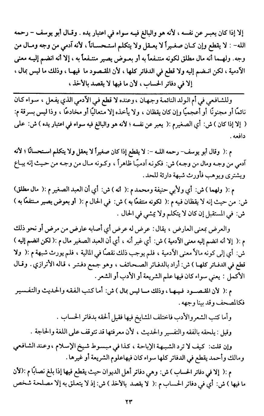 وإن قلت: كيف لا ترد الشبهة الإباحة، كذا في مبسوط شيخ الإسلام، وعند الشافعي ومالك وأحمد يقطع في الدفاتر كلها سواء كان فيها علوم الشريعة أو غيرها.