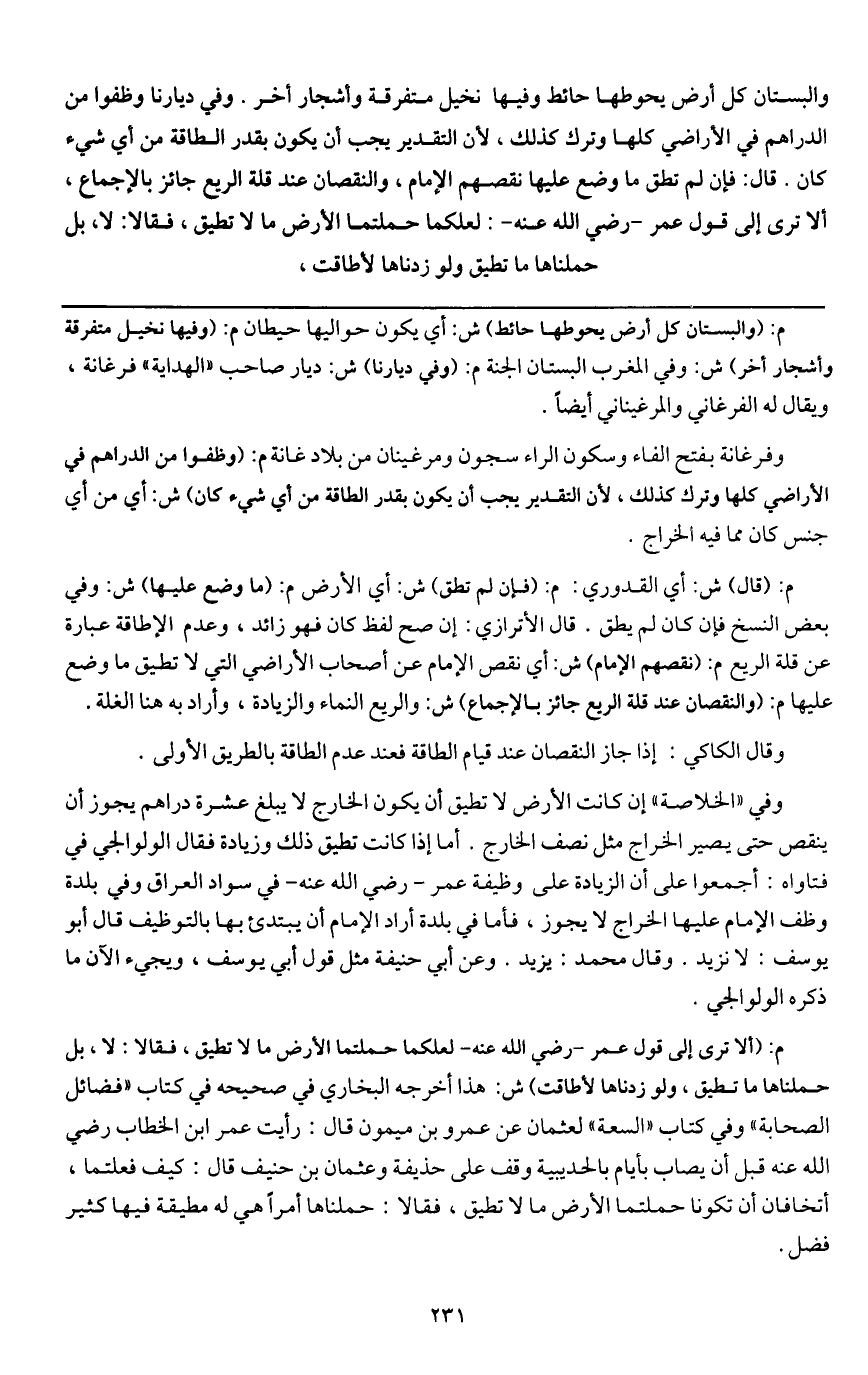 والبستان كل أرض يحوطها حائط وفيها نخيل متفرقة وأشجار أخر. وفي ديارنا وظفوا من الدراهم في الأراضي كلها وترك كذلك، لأن التقدير يجب أن يكون بقدر الطاقة من أي شيء كان. قال: فإن لم تطق ما وضع عليها نقصهم الإمام، والنقصان عند قلة الريع جائز بالإجماع، ألا ترى إلى قول عمر - رَضِيَ اللَّهُ عَنْهُ -: لعلكما حملتما الأرض ما لا تطيق، فقالا: لا، بل حملناها ما تطيق ولو زدناها لأطاقت،