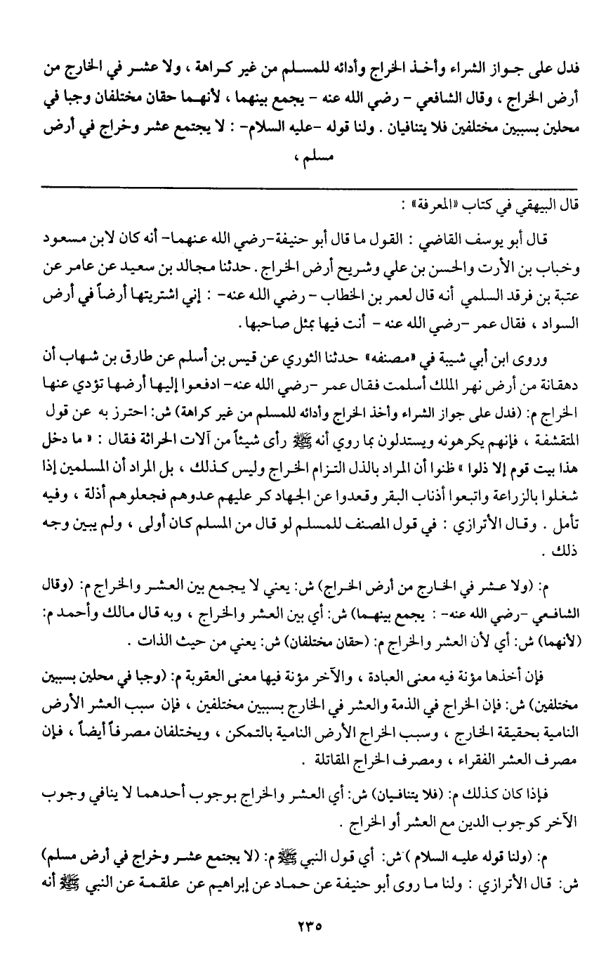 قال أبو يوسف القاضي: القول ما قال أبو حنيفة - رَضِيَ اللَّهُ عَنْهُمَا - أنه كان لابن مسعود وخباب بن الأرت والحسن بن علي وشريح أرض الخراج. حدثنا مجالد بن سعيد عن عامر عن عتبة بن فرقد السلمي أنه قال لعمر بن الخطاب - رَضِيَ اللَّهُ عَنْهُ -: إني اشتريتها أرضاً في أرض السواد، فقال عمر - رَضِيَ اللَّهُ عَنْهُ - أنت بمثل فيها بمثل صاحبها.