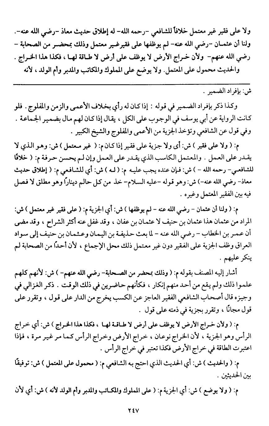 ولا على فقير غير معتمل خلافا للشافعي - رَحِمَهُ اللَّهُ - له إطلاق حديث معاذ - رَضِيَ اللَّهُ عَنْهُ - ولنا أن عثمان - رَضِيَ اللَّهُ عَنْهُ - لم يوظفها على فقير غير معتمل، وذلك بمحضر من الصحابة - رَضِيَ اللَّهُ عَنْهُمْ - ولأن خراج الأرض لا يوظف على أرض لا طاقة لها، فكذا هذا الخراج. والحديث محمول على المعتمل. ولا يوضع على المملوك والمكاتب والمدبر وأم الولد، لأنه