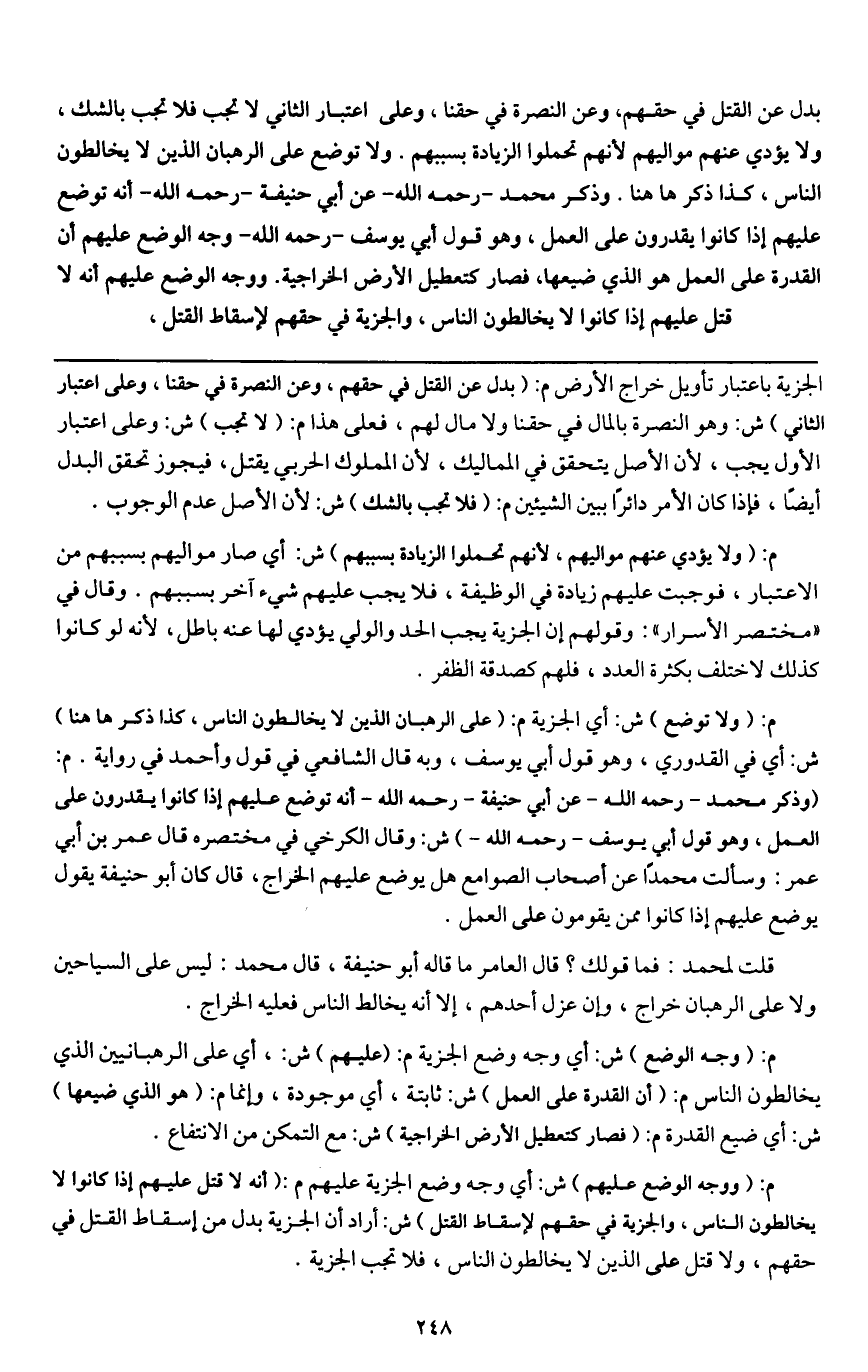 قلت لمحمد: فما قولك؟ قال: العامر ما قاله أبو حنيفة، قال محمد: ليس على السياحين ولا على الرهبان خراج، وإن عزل أحدهم، إلا أنه يخالط الناس فعليه الخراج.