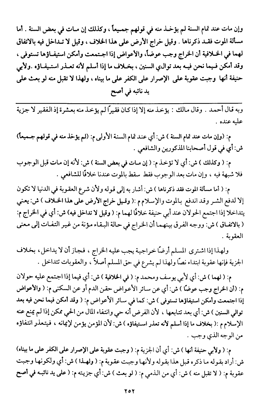 وإن مات عند تمام السنة لم يؤخذ منه في قولهم جميعا، وكذلك إن مات في بعض السنة. أما مسألة الموت فقد ذكرناها. وقيل: خراج الأرض على هذا الخلاف، وقيل: لا تداخل فيه بالاتفاق، لهما في الخلافية أن الخراج وجب عوضا، والأعواض إذا اجتمعت وأمكن استيفاؤها تستوفى، وقد أمكن فيما نحن فيه بعد توالي السنين، بخلاف ما إذا أسلم لأنه تعذر استيفاؤه. ولأبي حنيفة أنها وجبت عقوبة على الإصرار على الكفر على ما بيناه، ولهذا لا تقبل منه لو بعث على يد نائبه في أصح