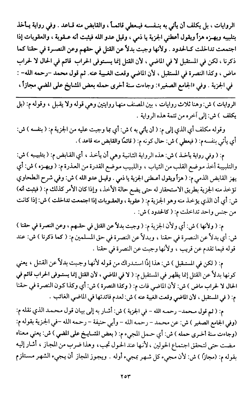 الروايات، بل يكلف أن يأتي به بنفسه فيعطي قائما، والقابض منه قاعد. وفي رواية: يأخذ بتلابيبه ويهزه هزا ويقول: أعطني الجزية يا ذمي، وقيل عدو الله، فيثبت أنه عقوبة، والعقوبات إذا اجتمعت تداخلت كالحدود. ولأنها وجبت بدلا عن القتل في حقهم وعن النصرة في حقنا، كما ذكرنا، لكن في المستقبل لا في الماضي، لأن القتل إنما يستوفى لحراب قائم في الحال لا لحراب ماض، وكذا النصرة في المستقبل، لأن الماضي وقعت الغيبة عنه، ثم قول محمد - رَحِمَهُ اللَّهُ - في الجزية. وفي " الجامع الصغير ": وجاءت سنة أخرى حمله بعض المشايخ على المضي مجازا،