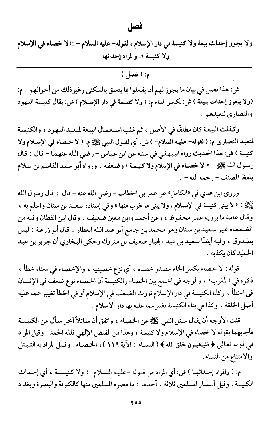فصل ولا يجوز إحداث بيعة ولا كنيسة في دار الإسلام، لقوله - عَلَيْهِ السَّلَامُ -: «لا خصاء في الإسلام ولا كنيسة» والمراد إحداثها