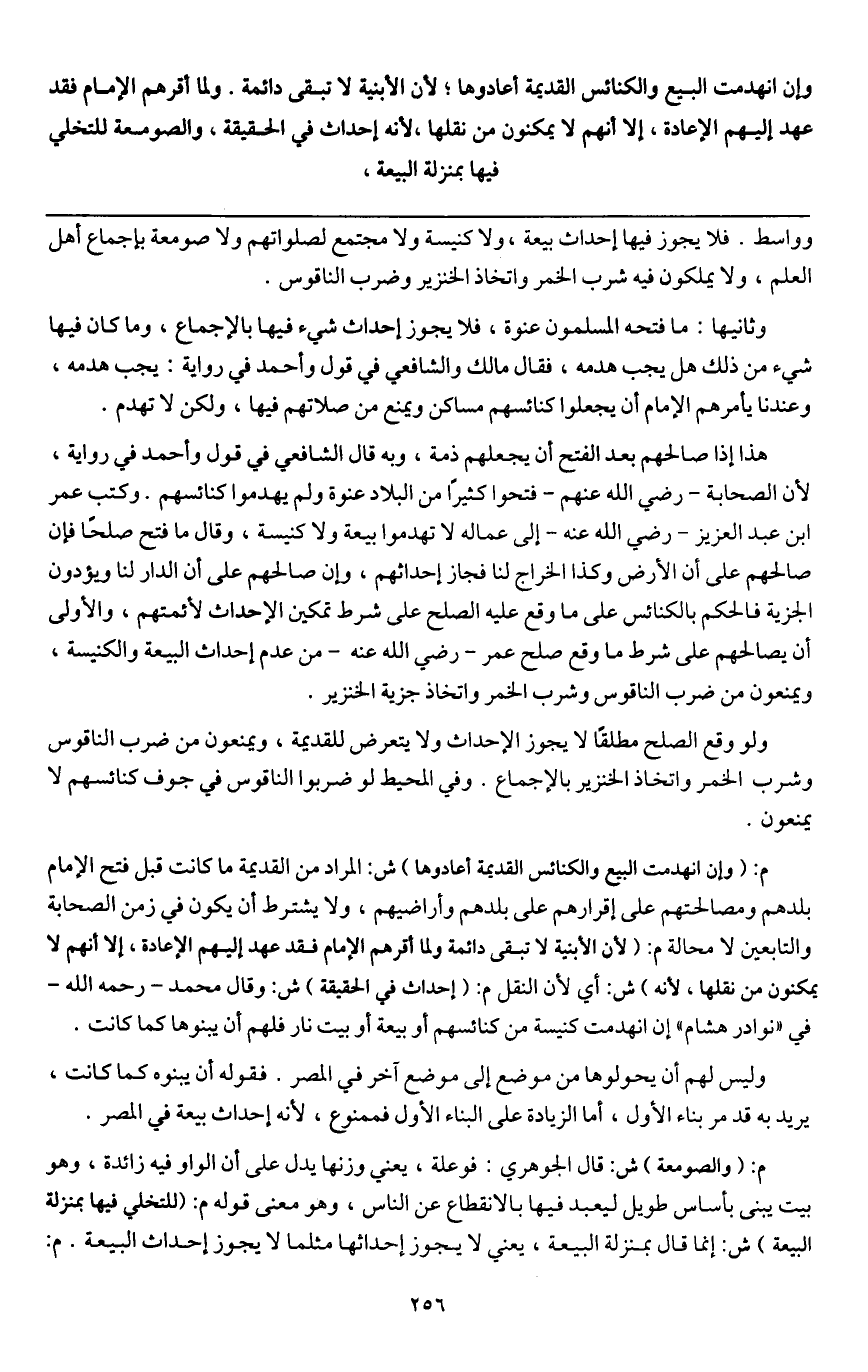 وثانيها: ما فتحه المسلمون عنوة، فلا يجوز إحداث شيء فيها بالإجماع، وما كان فيها شيء من ذلك هدمه، فقال مالك والشافعي في قول، وأحمد في رواية: يجب هدمه، وعندنا يأمرهم الإمام أن يجعلوا كنائسهم مساكن ويمنع من صلاتهم فيها، ولكن لا تهدم.
