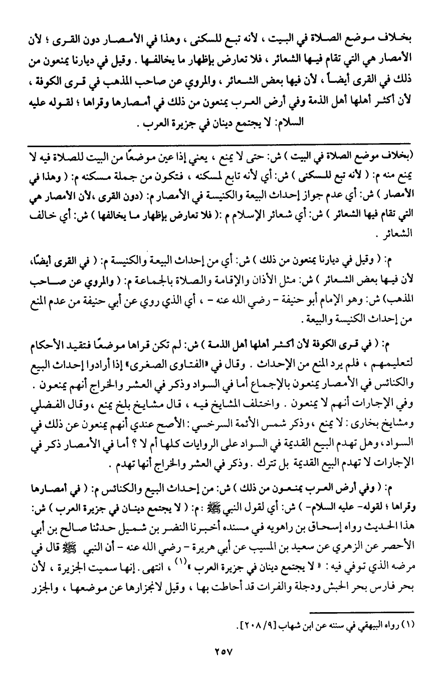 بخلاف موضع الصلاة في البيت؛ لأنه تبع للسكنى، وهذا في الأمصار دون القرى؛ لأن الأمصار هي التي تقام فيها الشعائر، فلا تعارض بإظهار ما يخالفها. وقيل في ديارنا يمنعون من ذلك في القرى أيضاً؛ لأن فيها بعض الشعائر، والمروي عن صاحب المذهب في قرى الكوفة؛ لأن أكثر أهلها أهل الذمة، وفي أرض العرب يمنعون من ذلك في أمصارها وقراها؛ لقوله - عَلَيْهِ السَّلَامُ -: «لا يجتمع دينان في جزيرة العرب»