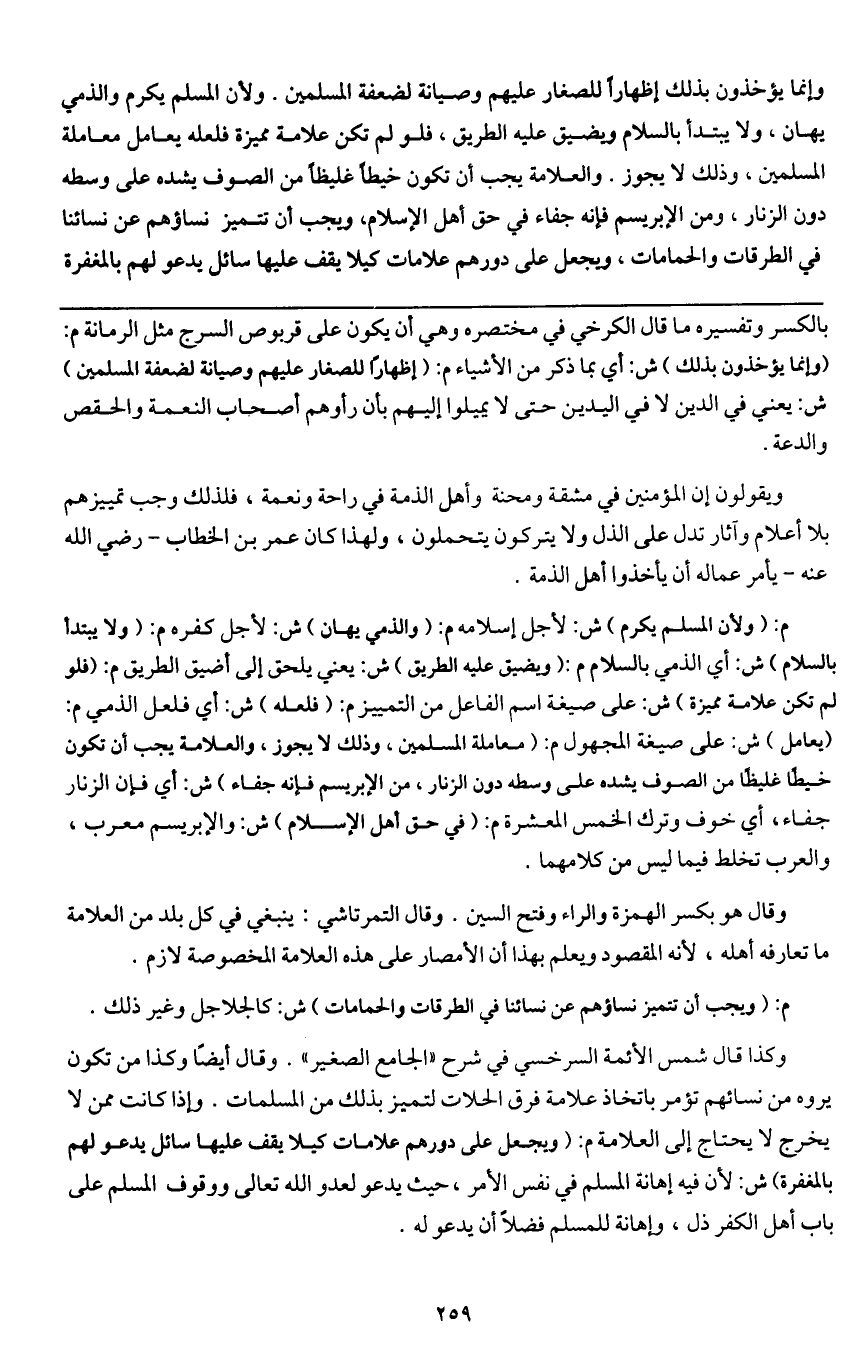 وإنما يؤخذون بذلك إظهارا للصغار عليهم وصيانة لضعفة المسلمين. ولأن المسلم يكرم والذمي يهان، ولا يبتدأ بالسلام ويضيق عليه الطريق، فلو لم تكن علامة مميزة فلعله يعامل معاملة المسلمين، وذلك لا يجوز. والعلامة يجب أن تكون خيطا غليظا من الصوف يشده على وسطه دون الزنار، ومن الإبريسم فإنه جفاء في حق أهل الإسلام، ويجب أن تتميز نساؤهم عن نسائنا في الطرقات والحمامات، ويجعل على دورهم علامات كي لا يقف عليها سائل يدعو لهم بالمغفرة.