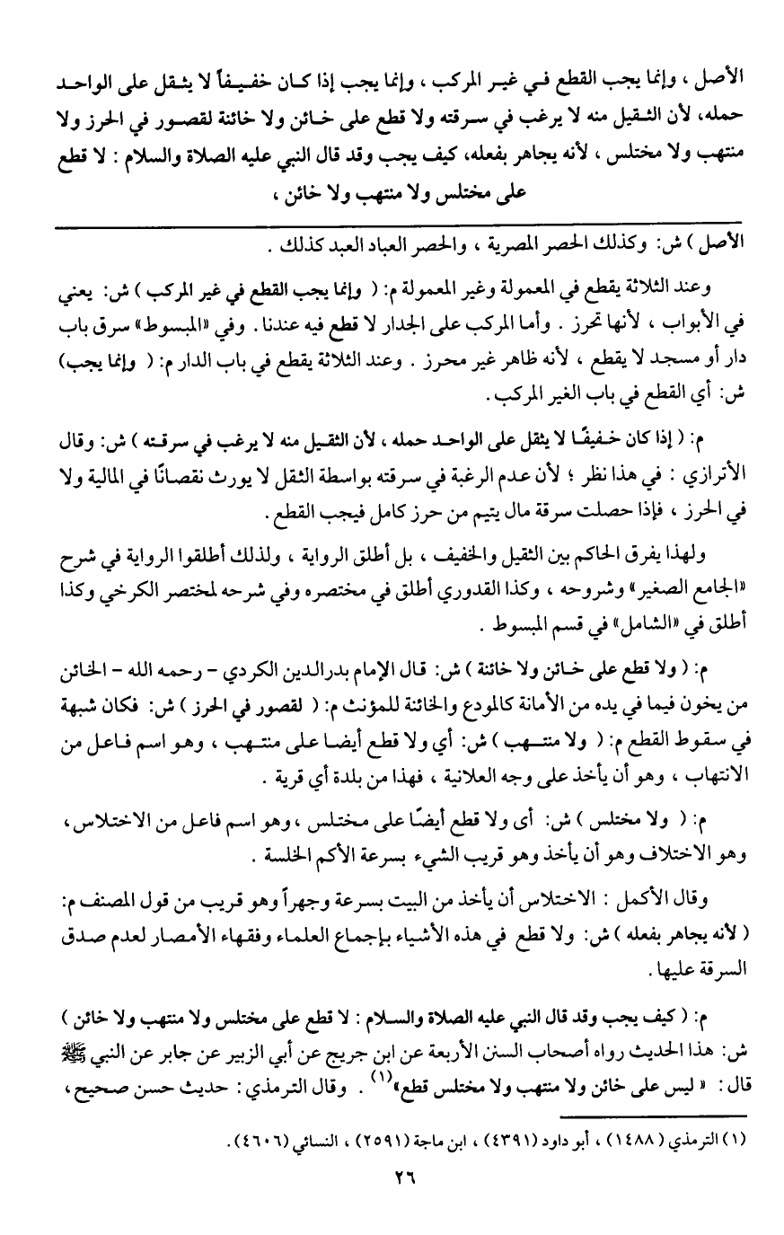 الأصل، وإنما يجب القطع في غير المركب، وإنما يجب إذا كان خفيفا لا يثقل على الواحد حمله؛ لأن الثقيل منه لا يرغب في سرقته ولا قطع على خائن ولا خائنة لقصور في الحرز ولا منتهب ولا مختلس؛ لأنه يجاهر بفعله، كيف يجب وقد قال النبي - عَلَيْهِ الصَّلَاةُ وَالسَّلَامُ -: «لا قطع على مختلس ولا منتهب ولا خائن»
