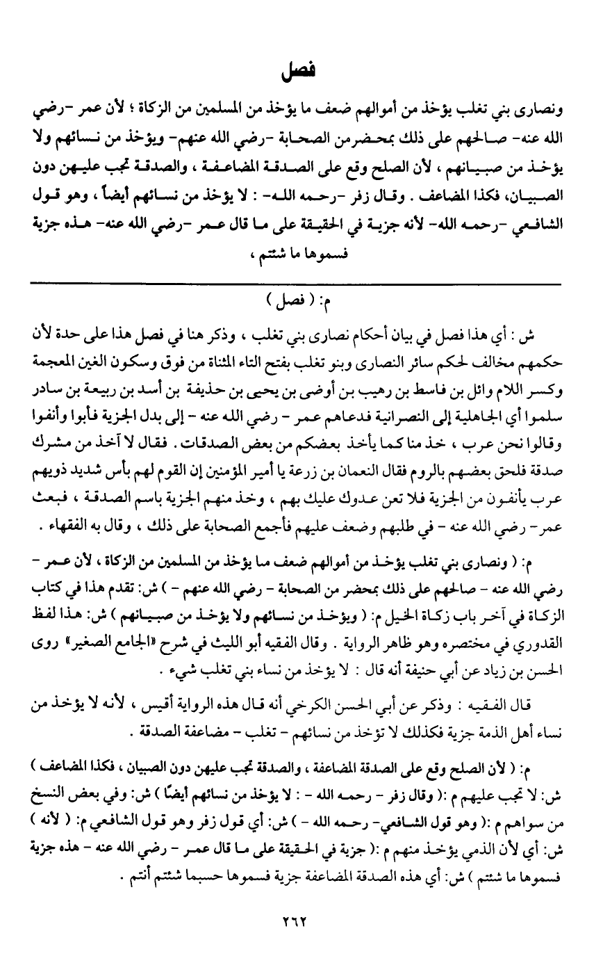 م: (فصل) ش: أي هذا فصل في بيان أحكام نصارى بني تغلب، وذكر هنا في فصل، هذا على حدة؛ لأن حكمهم مخالف لحكم سائر النصارى وبنو تغلب بفتح التاء المثناة من فوق وسكون الغين المعجمة وكسر اللام وائل بن فاسط بن رهيب بن أوضى بن يحيى بن حذيفة بن أسد بن ربيعة بن سادر سلموا أي الجاهلية إلى النصرانية، فدعاهم عمر - رَضِيَ اللَّهُ عَنْهُ - إلى بدل الجزية، فأبو وأنفوا، وقالوا: نحن عرب، خذ منا كما يأخذ بعضكم من بعض الصدقات. فقال لا آخذ من مشرك صدقة فلحق بعضهم بالروم فقال النعمان بن زرعة يا أمير المؤمنين إن القوم لهم بأس شديد، ذويهم عرب يأنفون من الجزية فلا تعن عدوك عليك بهم، وخذ منهم الجزية باسم الصدقة، فبعث عمر - رَضِيَ اللَّهُ عَنْهُ - في طلبهم وضعف عليهم فأجمع الصحابة على ذلك، وقال به الفقهاء.