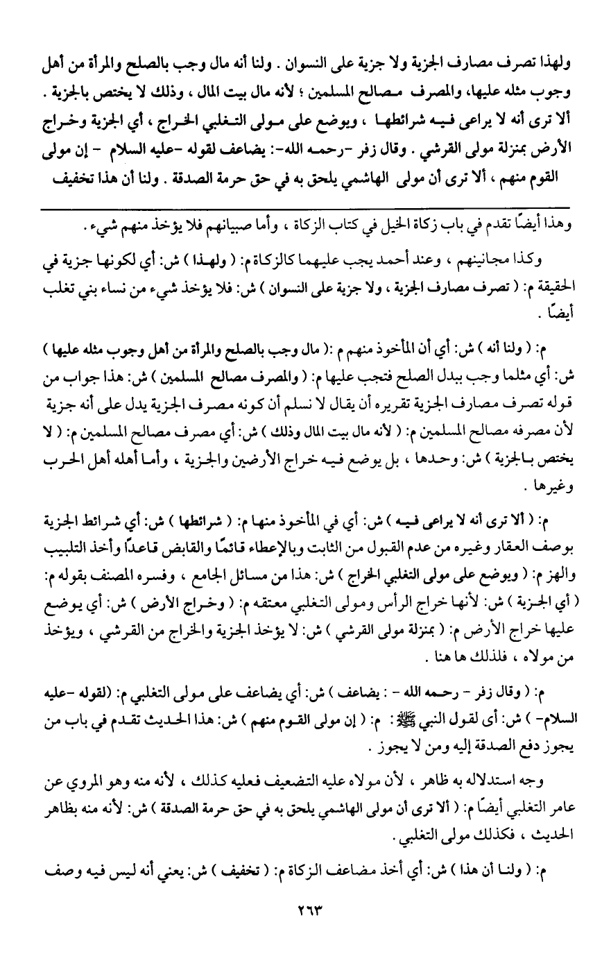 ولهذا تصرف مصارف الجزية ولا جزية على النسوان. ولنا أنه مال وجب بالصلح والمرأة من أهل وجوب مثله عليها، والمصرف مصالح المسلمين؛ لأنه مال بيت المال، وذلك لا يختص بالجزية ألا ترى أنه لا يراعى فيه شرائطها، ويوضع على مولى التغلبي الخراج، أي الجزية وخراج الأرض بمنزلة مولى القرشي. وقال زفر - رَحِمَهُ اللَّهُ -: يضاعف لقوله - عَلَيْهِ السَّلَامُ - إن مولى القوم منهم، ألا ترى أن مولى الهاشمي يلحق به في حق حرمة الصدقة. ولنا أن هذا تخفيف