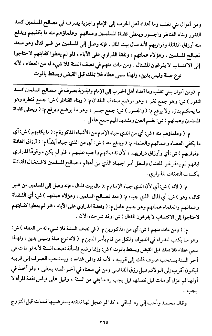 ومن أموال بني تغلب وما أهداه أهل الحرب إلى الإمام والجزية، يصرف في مصالح المسلمين كسد الثغور وبناء القناطر والجسور، ويعطى قضاة المسلمين وعمالهم وعلماؤهم منه ما يكفيهم، ويدفع منه أرزاق المقاتلة وذراريهم؛ لأنه مال بيت المال، فإنه وصل إلى المسلمين من غير قتال وهو معد لمصالح المسلمين، وهؤلاء عملتهم، ونفقة الذراري على الآباء، فلو لم يعطوا كفايتهم لاحتاجوا إلى الاكتساب لا يفرغون للقتال. ومن مات منهم في نصف السنة فلا شيء له من العطاء؛ لأنه نوع صلة وليس بدين، ولهذا سمي عطاء فلا يملك قبل القبض ويسقط بالموت