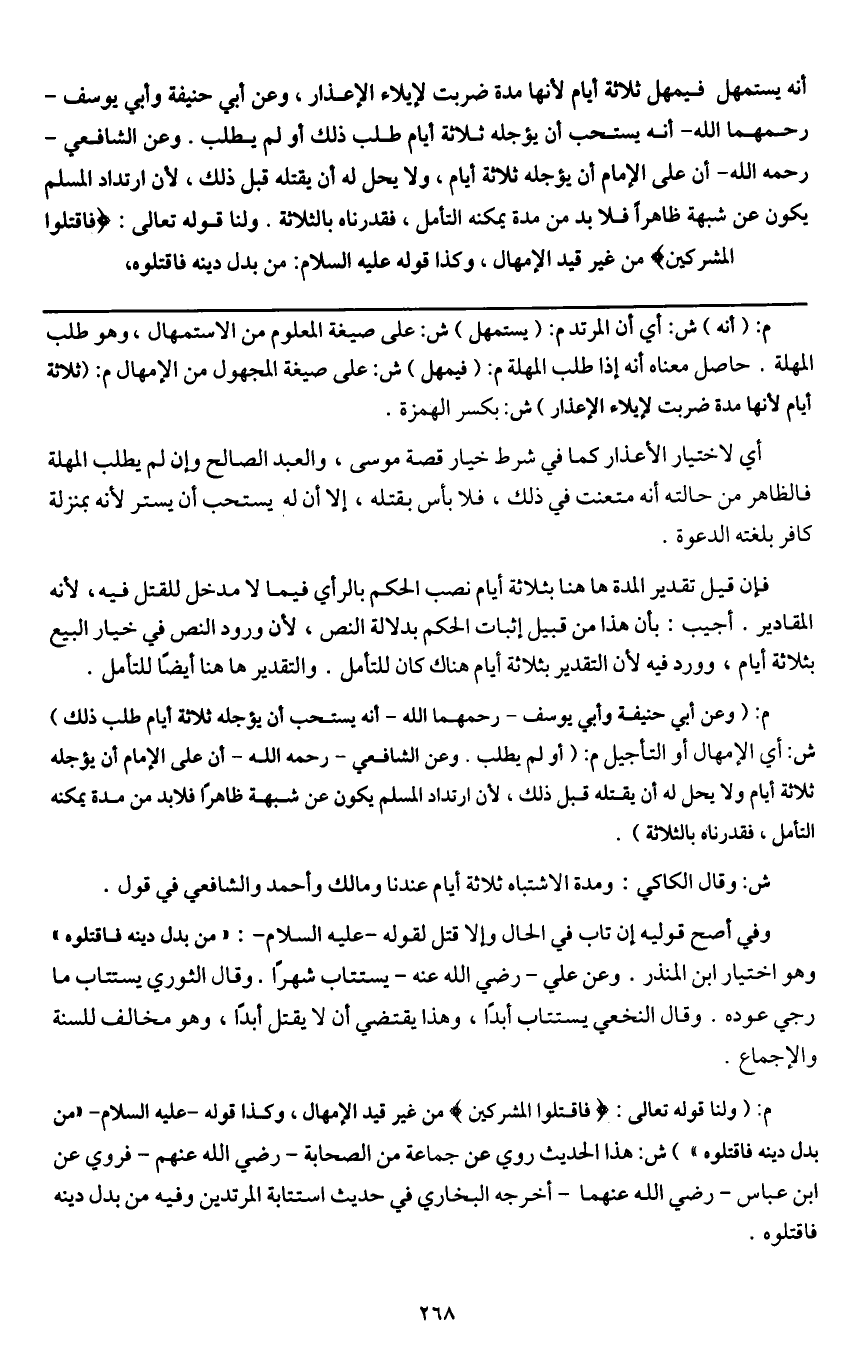 أنه يستمهل فيمهل ثلاثة أيام لأنها مدة ضربت لإيلاء الإعذار، وعن أبي حنيفة وأبي يوسف -رحمهما الله - أنه يستحب أن يؤجله ثلاثة أيام طلب ذلك أو لم يطلب. وعن الشافعي - رَحِمَهُ اللَّهُ - أن على الإمام أن يؤجله ثلاثة أيام، ولا يحل له أن يقتله قبل ذلك؛ لأن ارتداد المسلم يكون عن شبهة ظاهرا، فلا بد من مدة يمكنه التأمل، فقدرناه بالثلاثة. ولنا قَوْله تَعَالَى: {فَاقْتُلُوا الْمُشْرِكِينَ} [التوبة: 5] من غير قيد الإمهال، وكذا قوله - عَلَيْهِ السَّلَامُ -: «من بدل دينه فاقتلوه»