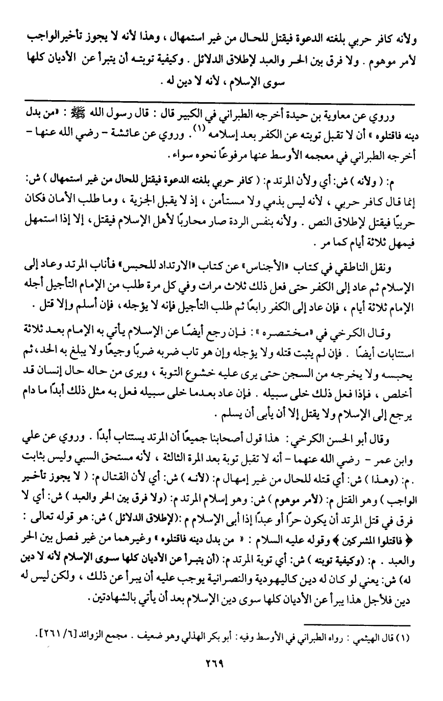 ـــــــــــــــــــــــــــــQوروي عن معاوية بن حيدة، أخرجه الطبراني في الكبير قال: قال رسول الله - صَلَّى اللَّهُ عَلَيْهِ وَسَلَّمَ -: «من بدل دينه فاقتلوه» أن لا تقبل توبته عن الكفر بعد إسلامه. وروي عن عائشة - رَضِيَ اللَّهُ عَنْهَا - أخرجه الطبراني في معجمه الأوسط عنها مرفوعاً نحوه سواء.