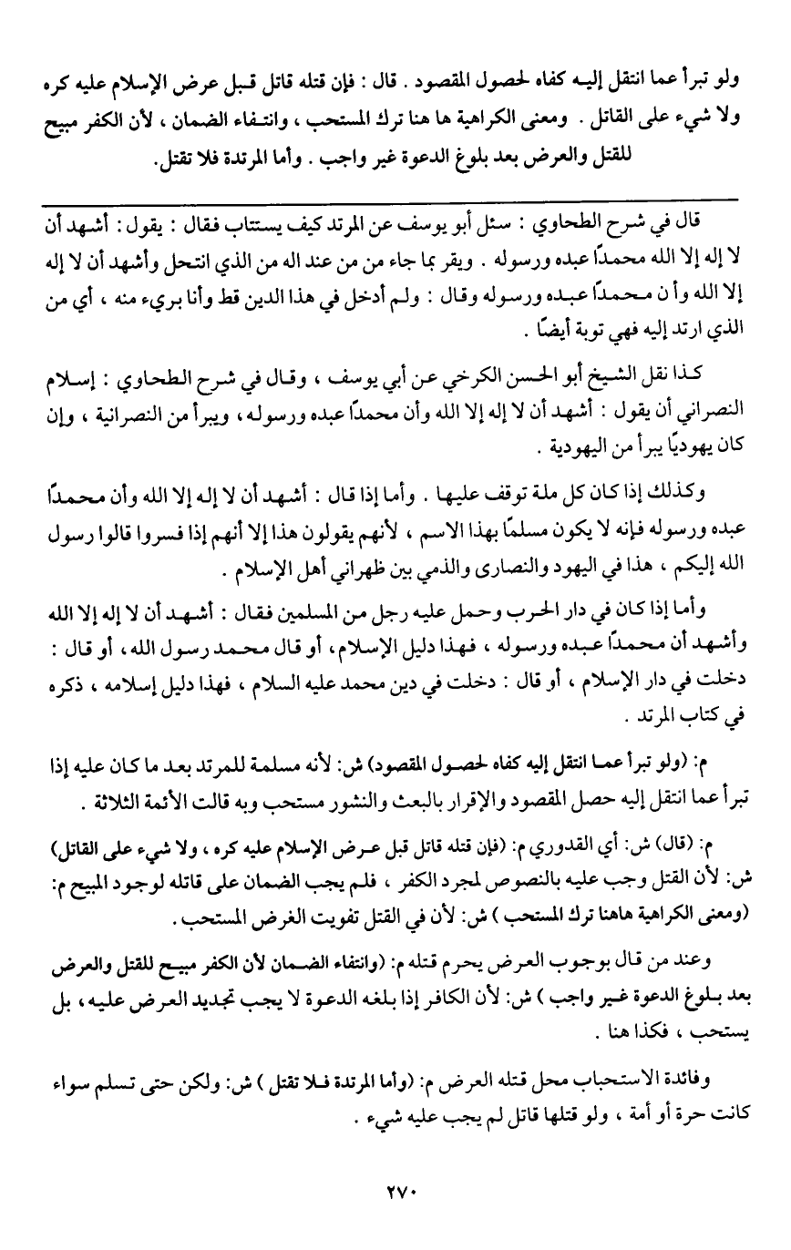 ـــــــــــــــــــــــــــــQقال في شرح الطحاوي: سئل أبو يوسف عن المرتد كيف يستتاب فقال: يقول: أشهد أن لا إله إلا الله وأن محمداً عبده ورسوله. ويقر بما جاء من عند الله من الذي انتحل، وأشهد أن لا إله إلا الله وأن محمداً عبده ورسوله، وقال: ولم أدخل في هذا الدين قط وأنا بريء منه، أي من الذي ارتد إليه فهي توبة أيضاً.
