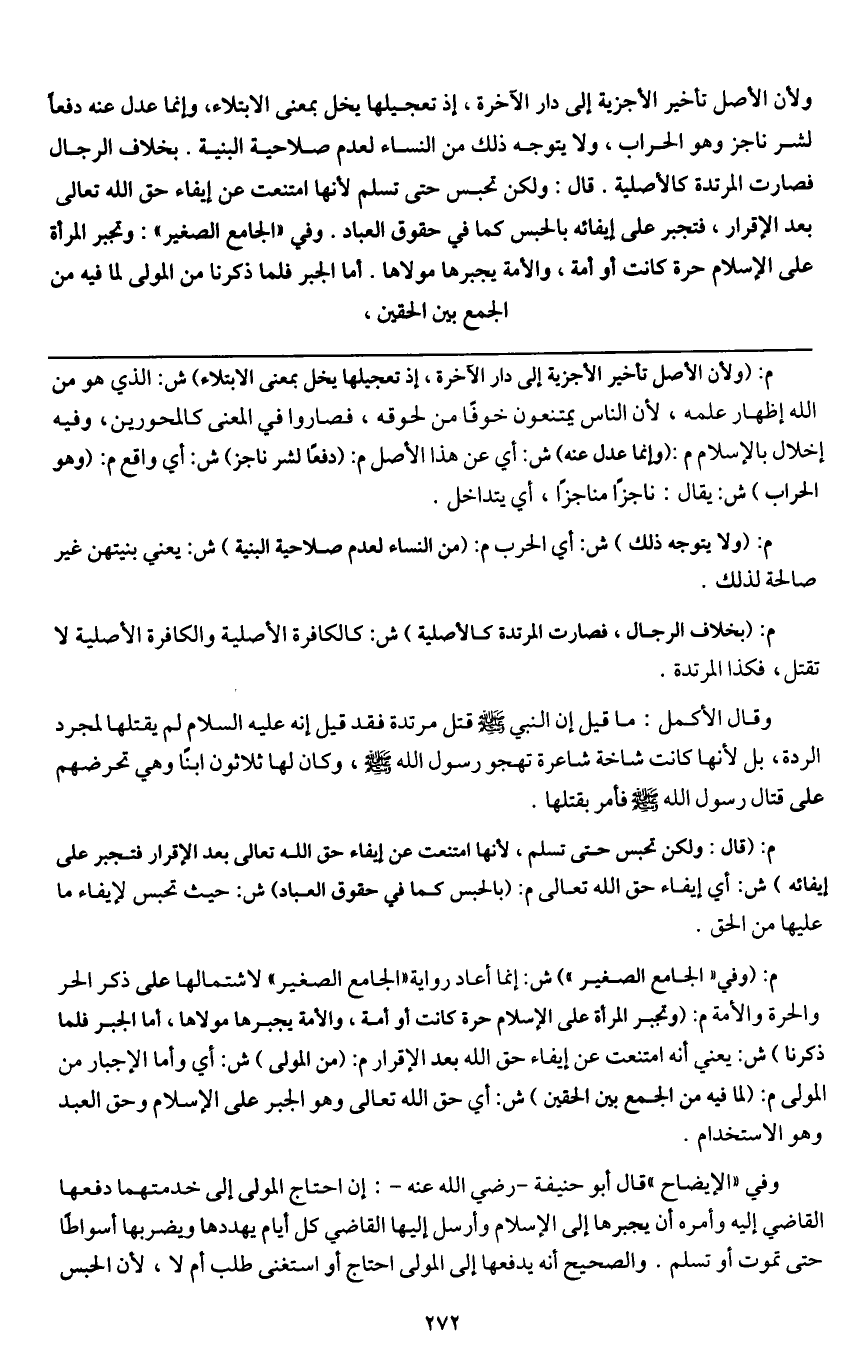 ولأن الأصل تأخير الأجزية إلى دار الآخرة، إذ تعجيلها يخل بمعنى الابتلاء، وإنما عدل عنه دفعا لشر ناجز وهو الحراب، ولا يتوجه ذلك من النساء لعدم صلاحية البنية. بخلاف الرجال فصارت المرتدة كالأصلية. قال: ولكن تحبس حتى تسلم لأنها امتنعت عن إيفاء حق الله تعالى بعد الإقرار، فتجبر على إيفائه بالحبس كما في حقوق العباد. وفي " الجامع الصغير ": وتجبر المرأة على الإسلام حرة كانت أو أمة، والأمة يجبرها مولاها. أما الجبر فلما ذكرنا من المولى لما فيه من الجمع بين الحقين،