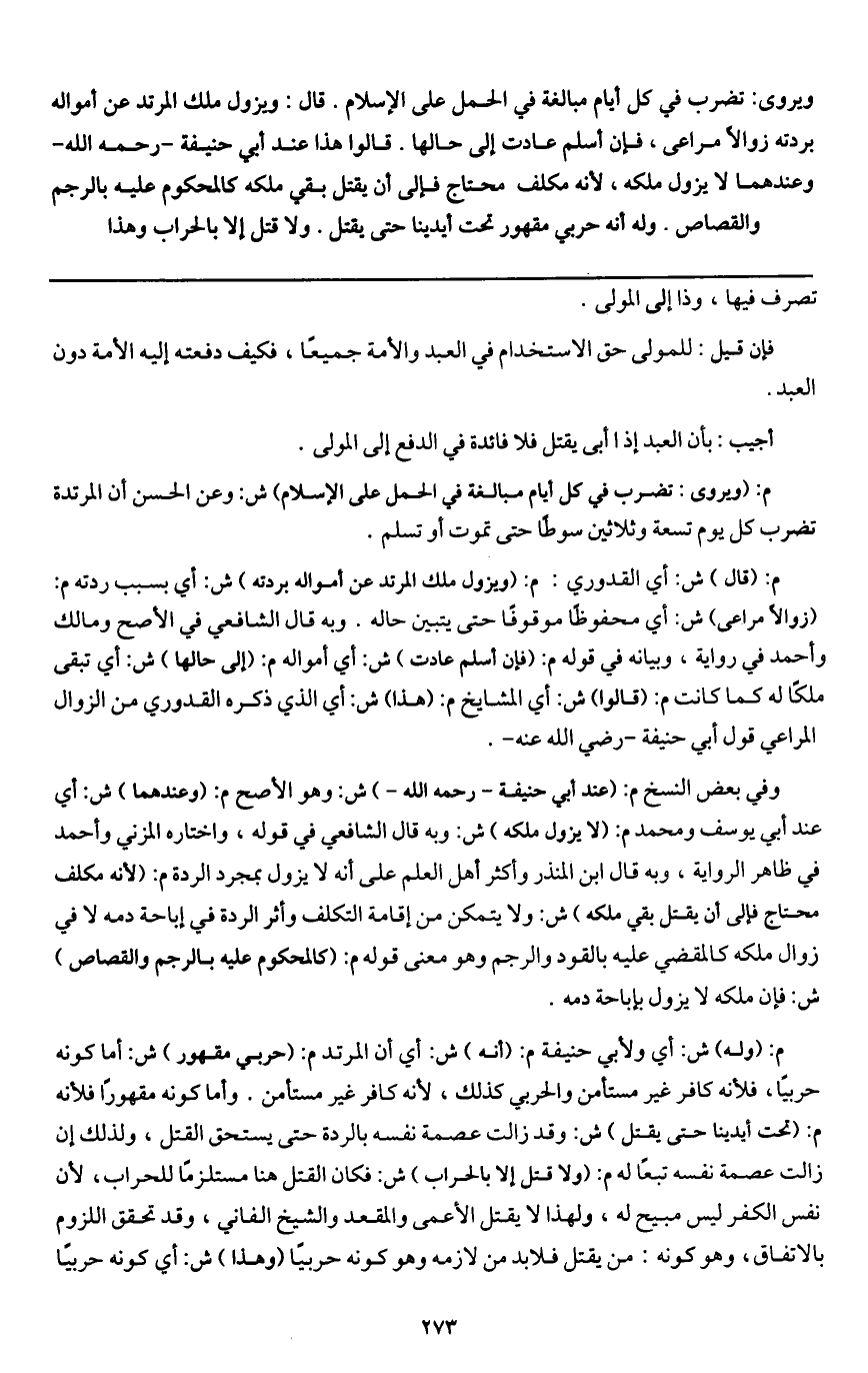 وفي بعض النسخ م: (عند أبي حنيفة - رَحِمَهُ اللَّهُ -) ش: وهو الأصح م: (وعندهما) ش: أي عند أبي يوسف ومحمد م: (لا يزول ملكه) ش: وبه قال الشافعي في قوله، واختاره المزني وأحمد في ظاهر الرواية، وبه قال ابن المنذر وأكثر أهل العلم على أنه لا يزول بمجرد الردة م: (لأنه مكلف محتاج فإلى أن يقتل بقي ملكه) ش: ولا يتمكن من إقامة التكلف وأثر الردة في إباحة دمه لا في زوال ملكه كالمقضي عليه بالقود والرجم وهو معنى قوله م: (كالمحكوم عليه بالرجم والقصاص) ش: فإن ملكه لا يزول بإباحة دمه.