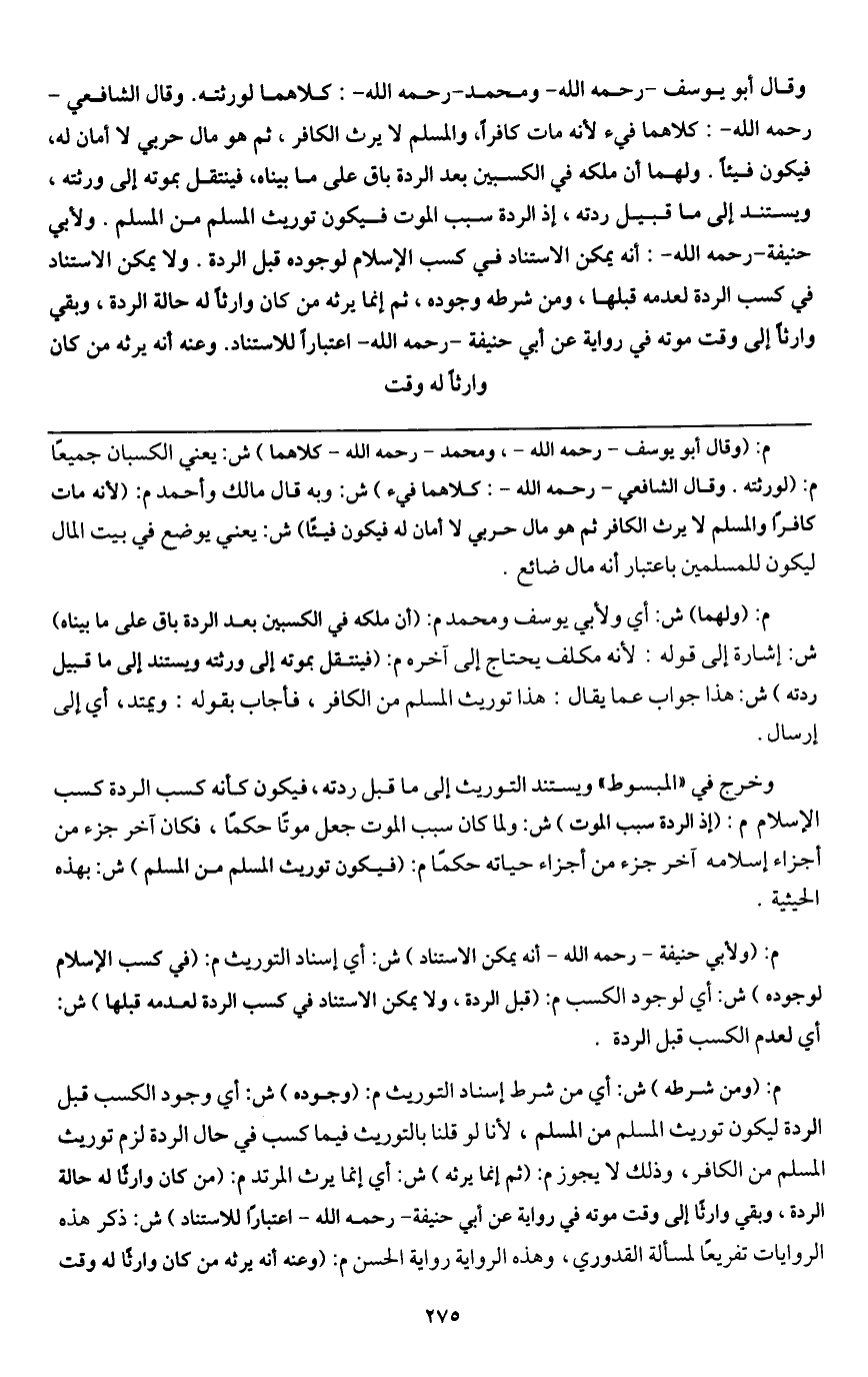 وخرج في " المبسوط " ويستند التوريث إلى ما قبل ردته، فيكون كأنه كسب الردة كسب الإسلام م: (إذ الردة سبب الموت) ش: ولما كان سبب الموت جعل موتاً حكماً، فكان آخر جزء من أجزاء إسلامه آخر جزء من أجزاء حياته حكماً م: (فيكون توريث المسلم من المسلم) ش: بهذه الحيثية.