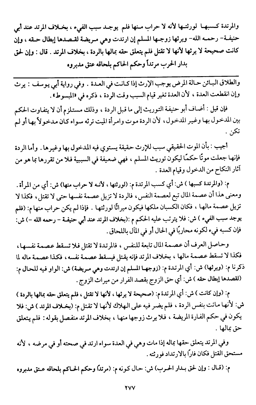 ـــــــــــــــــــــــــــــQوالطلاق البائن حالة المرض يوجب الإرث إذا كانت في العدة. وفي رواية أبي يوسف: يرث وإن انقطعت العدة؛ لأن العدة تغير قيام السبب وقت الردة، ذكره في " المبسوط ".