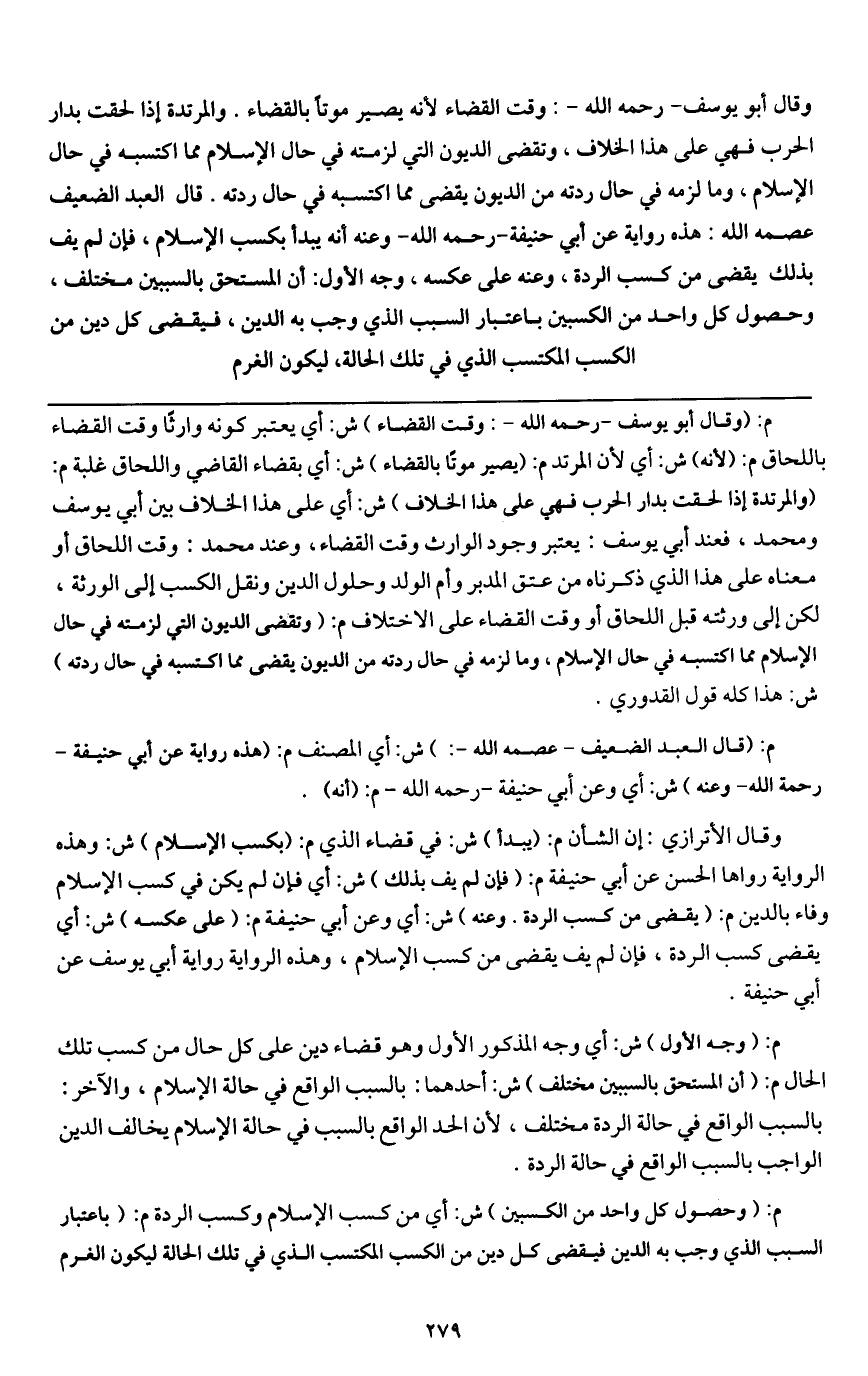 وقال أبو يوسف - رَحِمَهُ اللَّهُ -: وقت القضاء لأنه يصير موتا بالقضاء. والمرتدة إذا لحقت بدار الحرب فهي على هذا الخلاف، وتقضى الديون التي لزمته في حال الإسلام مما اكتسبه في حال الإسلام، وما لزمه في حال ردته من الديون يقضى مما اكتسبه في حال ردته. قال العبد الضعيف عصمه الله: هذه رواية عن أبي حنيفة - رَحِمَهُ اللَّهُ - وعنه أنه يبدأ بكسب الإسلام، فإن لم يف بذلك يقضي من كسب الردة، وعنه على عكسه، وجه الأول: أن المستحق بالسببين مختلف، وحصول كل واحد من الكسبين باعتبار السبب الذي وجب به الدين، فيقضى كل دين من الكسب المكتسب الذي في تلك الحالة، ليكون الغرم