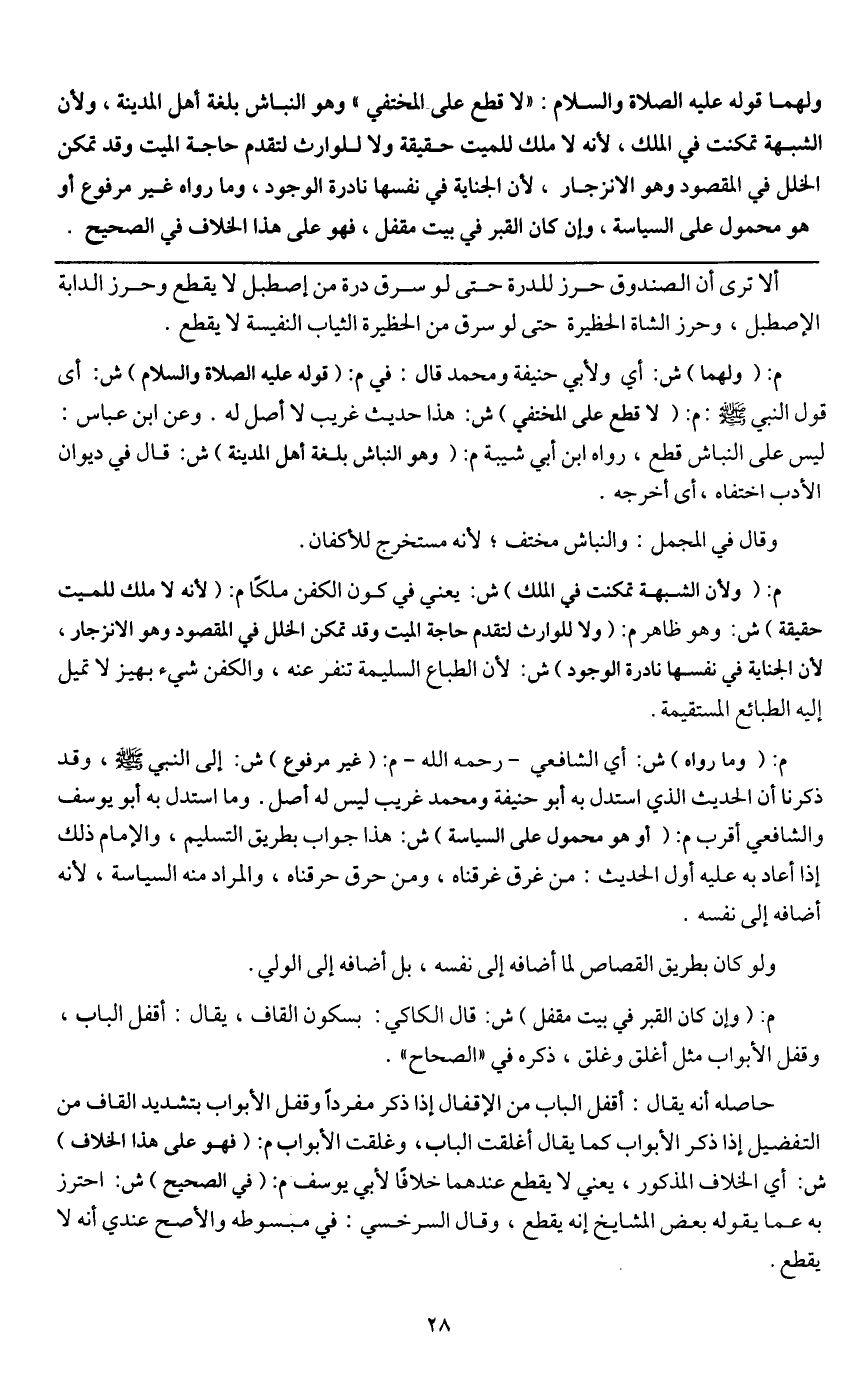 ـــــــــــــــــــــــــــــQألا ترى أن الصندوق حرز للدرة حتى لو سرق درة من إصطبل لا يقطع وحرز الدابة الإصطبل، وحرز الشاة الحظيرة حتى لو سرق من الحظيرة الثياب النفيسة لا يقطع.