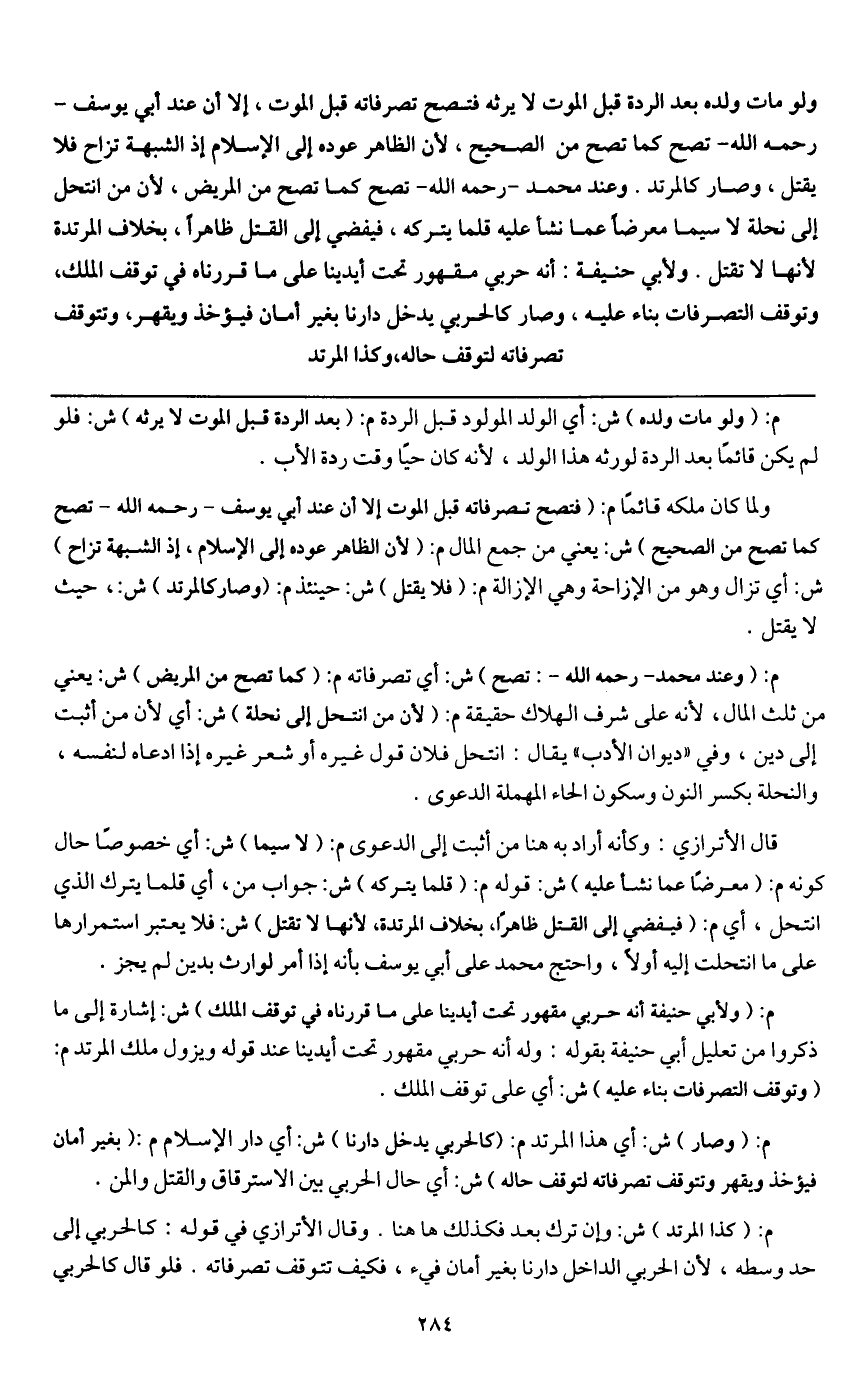 ولو مات ولده بعد الردة قبل الموت لا يرثه فتصح تصرفاته قبل الموت، إلا أن عند أبي يوسف - رَحِمَهُ اللَّهُ - تصح كما تصح من الصحيح؛ لأن الظاهر عوده إلى الإسلام إذ الشبهة تزاح فلا يقتل، وصار كالمرتد. وعند محمد - رَحِمَهُ اللَّهُ - تصح كما تصح من المريض؛ لأن من انتحل إلى نحلة، لا سيما معرضا عما نشأ عليه قلما يتركه، فيفضي إلى القتل ظاهرا، بخلاف المرتدة؛ لأنها لا تقتل. ولأبي حنيفة: أنه حربي مقهور تحت أيدينا على ما قررناه في توقف الملك، وتوقف التصرفات بناء عليه، وصار كالحربي يدخل دارنا بغير أمان فيؤخذ ويقهر، وتتوقف تصرفاته لتوقف حاله، وكذا المرتد