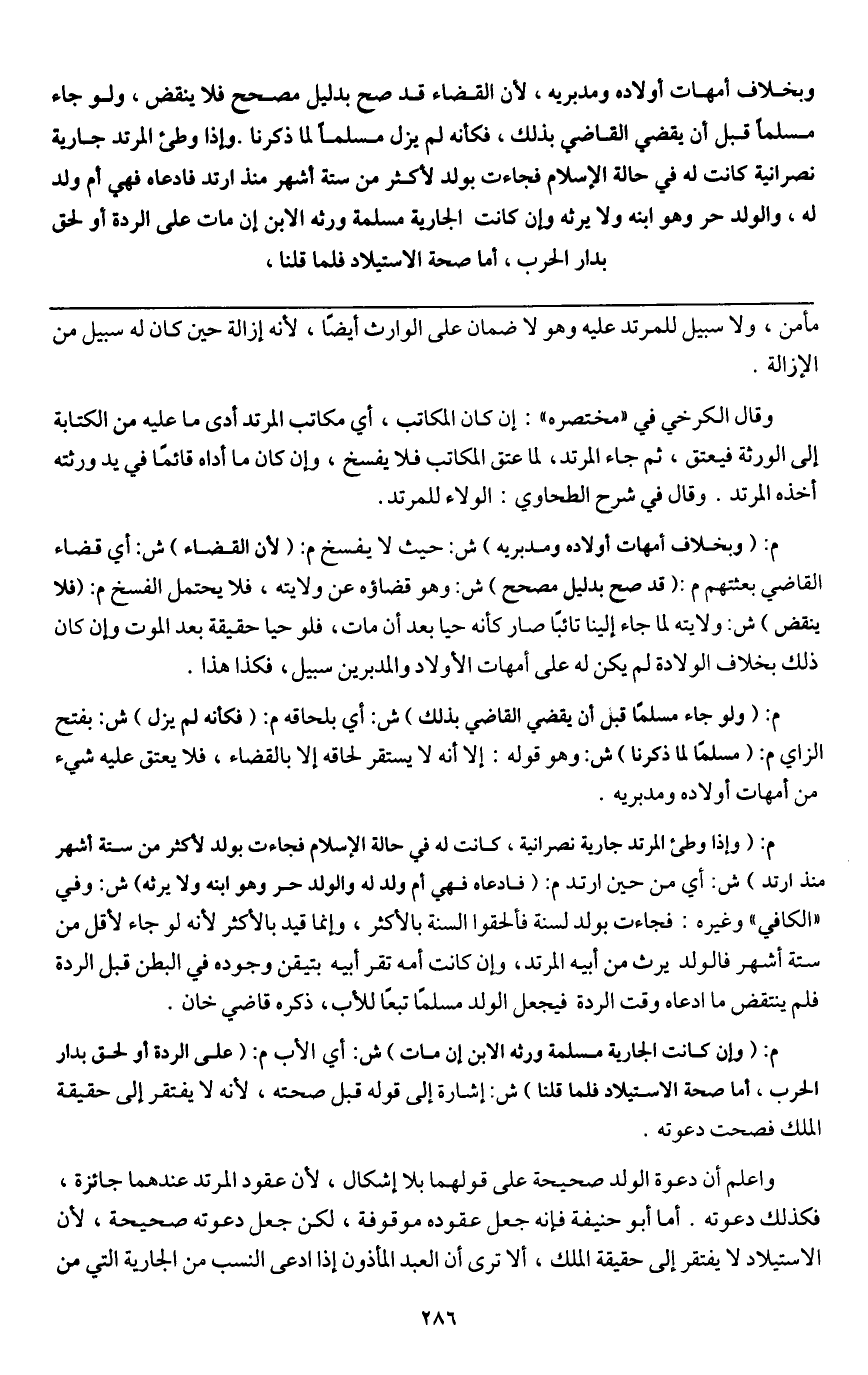 م: (وإذا وطئ المرتد جارية نصرانية، كانت له في حالة الإسلام فجاءت بولد لأكثر من ستة أشهر منذ ارتد) ش: أي من حين ارتد م: (فادعاه فهي أم ولد له والولد حر وهو ابنه ولا يرثه) ش: وفي " الكافي " وغيره: فجاءت بولد لسنة فألحقوا السنة بالأكثر، وإنما قيد بالأكثر لأنه لو جاء لأقل من ستة أشهر فالولد يرث من أبيه المرتد، وإن كانت أمه تقر أبيه بتيقن وجوده في البطن قبل الردة فلم ينتقض ما ادعاه وقت الردة فيجعل الولد مسلماً تبعاً للأب، ذكره قاضي خان.