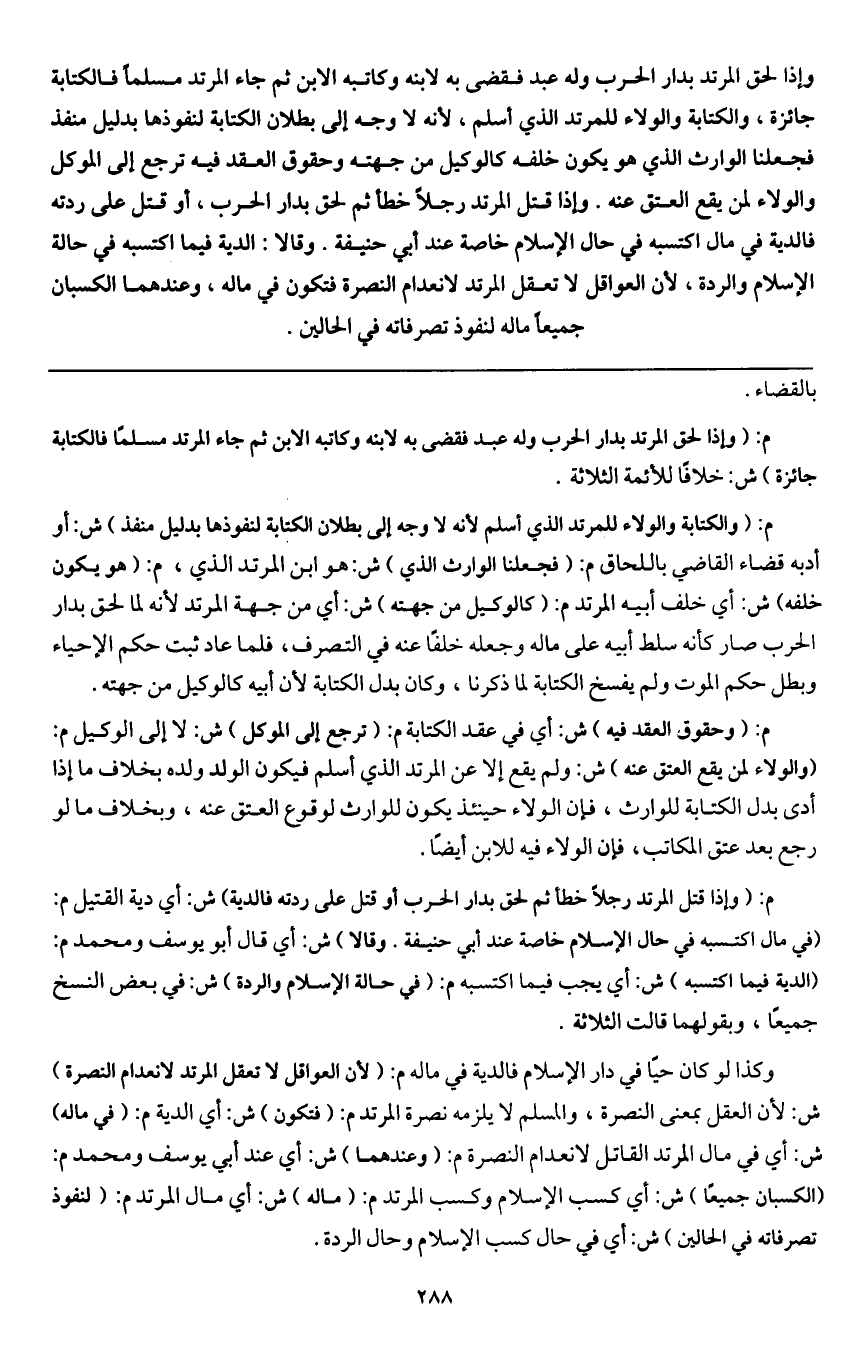 وإذا لحق المرتد بدار الحرب وله عبد فقضى به لابنه وكاتبه الابن ثم جاء المرتد مسلما فالكتابة جائزة، والكتابة والولاء للمرتد الذي أسلم؛ لأنه لا وجه إلى بطلان الكتابة لنفوذها بدليل منفذ فجعلنا الوارث الذي هو يكون خلفه كالوكيل من جهته وحقوق العقد فيه ترجع إلى الموكل والولاء لمن يقع العتق عنه.