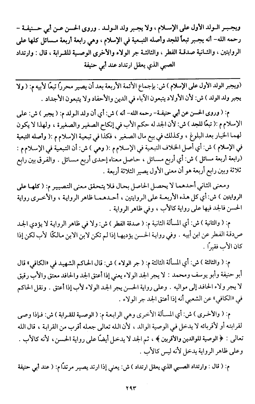 ويجبر الولد الأول على الإسلام، ولا يجبر ولد الولد. وروى الحسن عن أبي حنيفة - رَحِمَهُ اللَّهُ - أنه يجبر تبعا للجد وأصله التبعية في الإسلام، وهي رابعة أربعة مسائل كلها على الروايتين والثانية صدقة الفطر، والثالثة جر الولاء، والأخرى الوصية للقرابة، قال: وارتداد الصبي الذي يعقل ارتداد عند أبي حنيفة