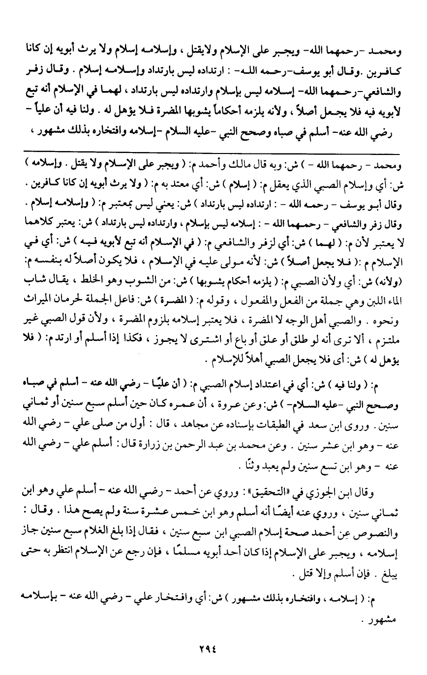 وقال ابن الجوزي في " التحقيق ": وروي عن أحمد - رَضِيَ اللَّهُ عَنْهُ - أسلم علي وهو ابن ثماني سنين، وروي عنه أيضاً أنه أسلم وهو ابن خمس عشرة سنة ولم يصح هذا. وقال: والنصوص عن أحمد صحة إسلام الصبي ابن سبع سنين، فقال إذا بلغ الغلام سبع سنين جاز إسلامه، ويجبر على الإسلام إذا كان أحد أبويه مسلماً، فإن رجع عن الإسلام انتظر به حتى يبلغ. فإن أسلم وإلا قتل.