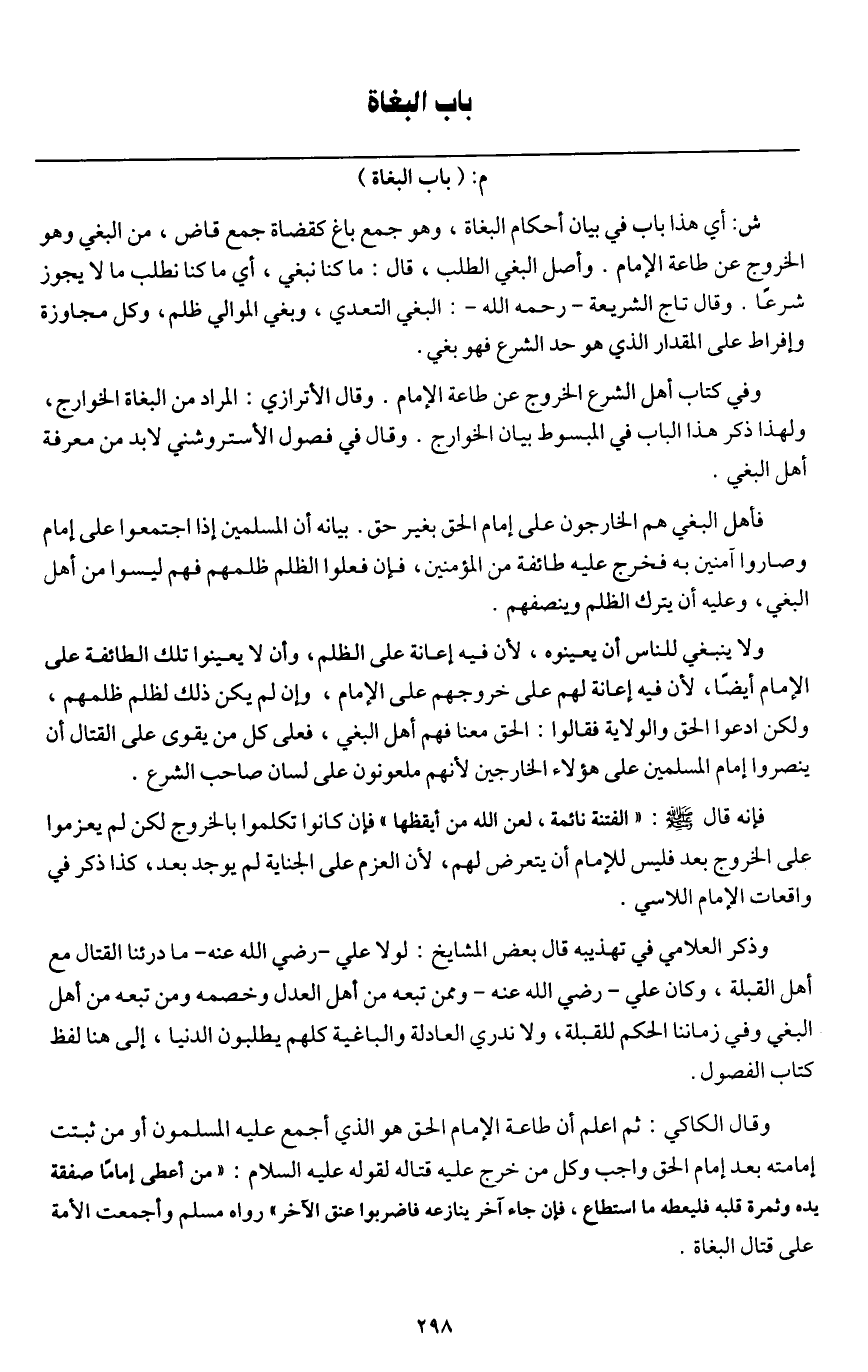 وفي كتاب أهل الشرع الخروج عن طاعة الإمام. وقال الأترازي: المراد من البغاة الخوارج، ولهذا ذكر هذا الباب في المبسوط بيان الخوارج. وقال في فصول الأستروشني لا بد من معرفة أهل البغي.