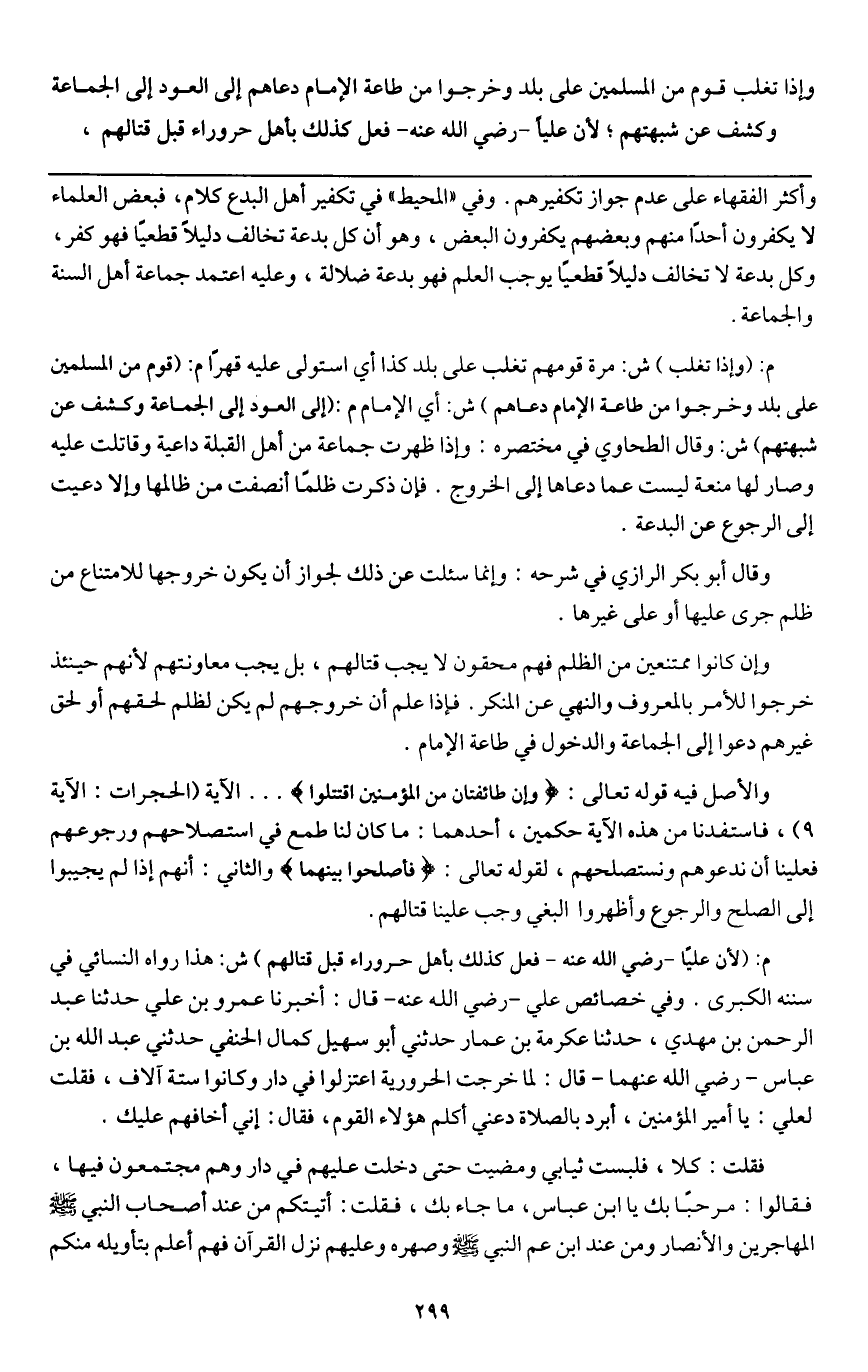 فقلت: كلا، فلبست ثيابي ومضيت حتى دخلت عليهم في دار وهم مجتمعون فيها، فقالوا: مرحباً بك يا بن عباس، ما جاء بك، فقلت: أتيتكم من عند أصحاب النبي - صَلَّى اللَّهُ عَلَيْهِ وَسَلَّمَ - المهاجرين والأنصار، ومن عند ابن عم النبي - صَلَّى اللَّهُ عَلَيْهِ وَسَلَّمَ - وصهره، وعليهم نزل القرآن فهم أعلم بتأويله منكم
