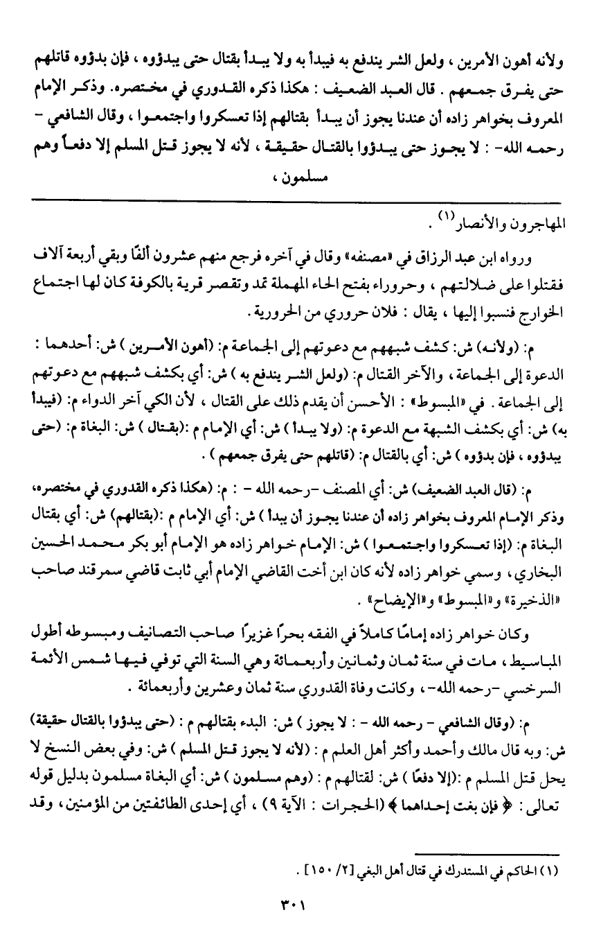 م: (قال العبد الضعيف) ش: أي المصنف - رَحِمَهُ اللَّهُ -: م: (هكذا ذكره القدوري في مختصره، وذكر الإمام المعروف بخواهر زاده أن عندنا يجوز أن يبدأ) ش: أي الإمام م: (بقتالهم) ش: أي بقتال البغاة م: (إذا تعسكروا واجتمعوا) ش: الإمام خواهر زاده هو الإمام أبو بكر محمد الحسين البخاري، وسمي خواهر زاده؛ لأنه كان ابن أخت القاضي الإمام أبي ثابت قاضي سمرقند صاحب " الذخيرة " و " المبسوط " و " الإيضاح ".