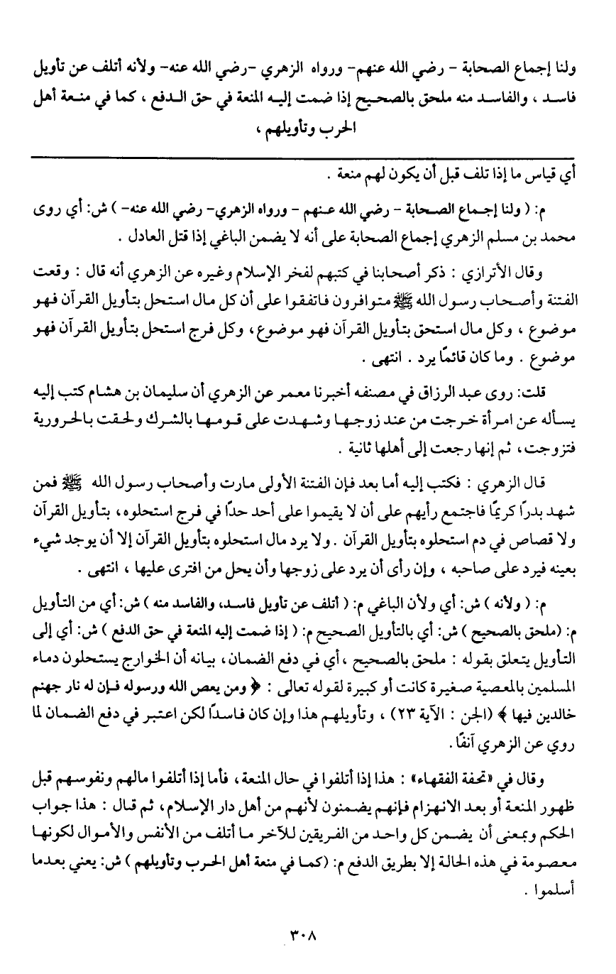 وقال الأترازي: ذكر أصحابنا في كتبهم لفخر الإسلام وغيره عن الزهري أنه قال: وقعت الفتنة وأصحاب رسول الله - صَلَّى اللَّهُ عَلَيْهِ وَسَلَّمَ - متوافرون فاتفقوا على أن كل مال استحل بتأويل القرآن فهو موضوع، وكل مال استحق بتأويل القرآن فهو موضوع، وكل فرج استحل بتأويل القرآن فهو موضوع. وما كان قائماً يرد. انتهى.