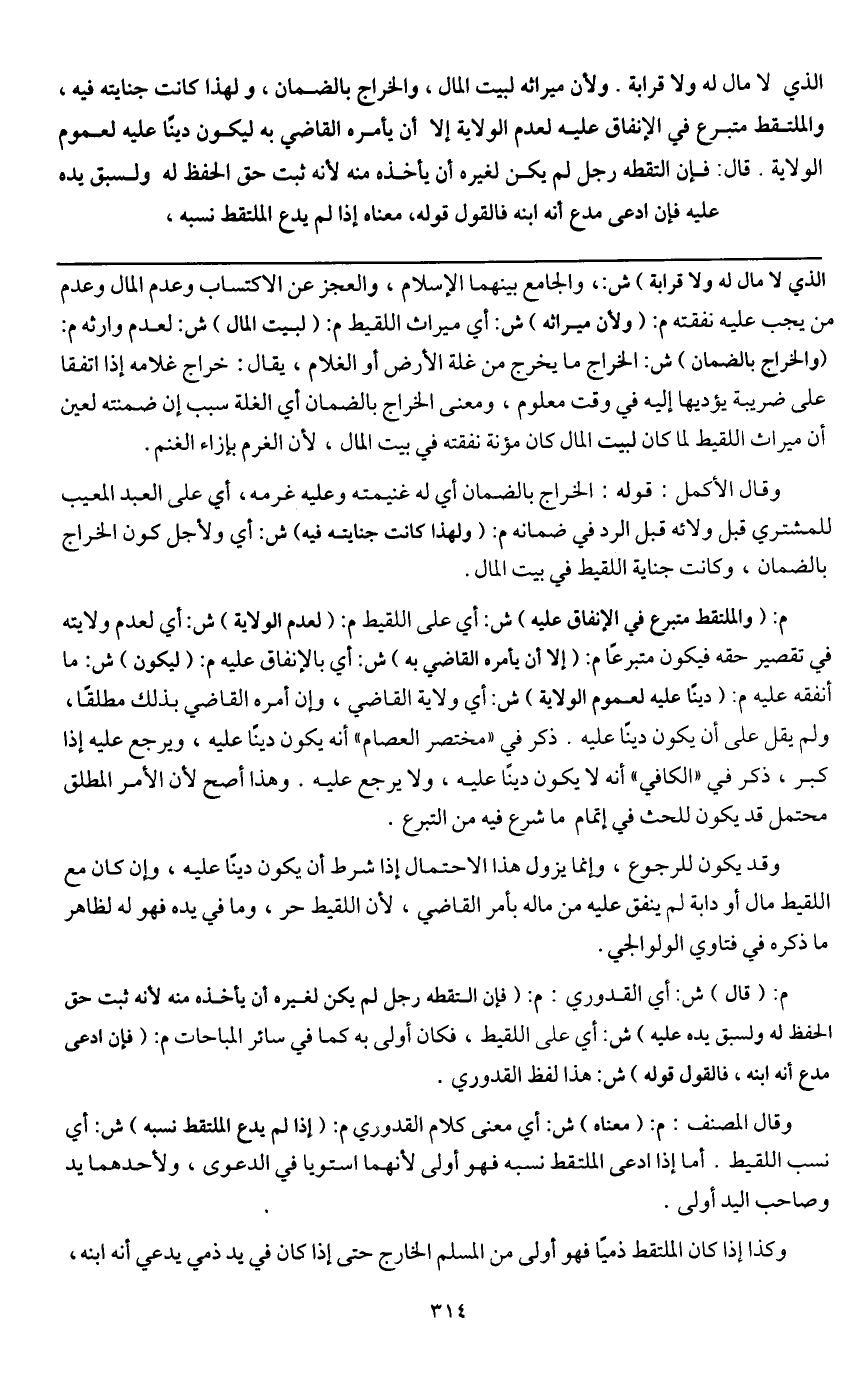ـــــــــــــــــــــــــــــQالذي لا مال له ولا قرابة) ش:، والجامع بينهما الإسلام، والعجز عن الاكتساب وعدم المال وعدم من يجب عليه نفقته م: (ولأن ميراثه) ش: أي ميراث اللقيط م: (لبيت المال) ش: لعدم وارثه م: (والخراج بالضمان) ش: الخراج ما يخرج من غلة الأرض أو الغلام، يقال: خراج غلامه إذا اتفقا على ضريبة يؤديها إليه في وقت معلوم، ومعنى الخراج بالضمان أي الغلة سبب إن ضمنته لعين أن ميراث اللقيط لما كان لبيت المال كان مؤنة نفقته في بيت المال؛ لأن الغرم بإزاء الغنم.