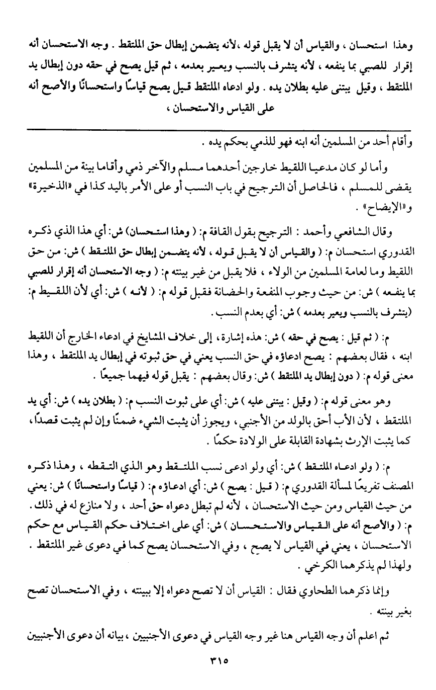 وقال الشافعي وأحمد: الترجيح بقول القافة م: (وهذا استحسان) ش: أي هذا الذي ذكره القدوري استحسان م: (والقياس أن لا يقبل قوله؛ لأنه يتضمن إبطال حق الملتقط) ش: من حق اللقيط وما لعامة المسلمين من الولاء، فلا يقبل من غير بينته م: (وجه الاستحسان أنه إقرار للصبي بما ينفعه) ش: من حيث وجوب المنفعة والحضانة فقبل قوله م: (لأنه) ش: أي لأن اللقيط م: (يتشرف بالنسب ويعير بعدمه) ش: أي بعدم النسب.