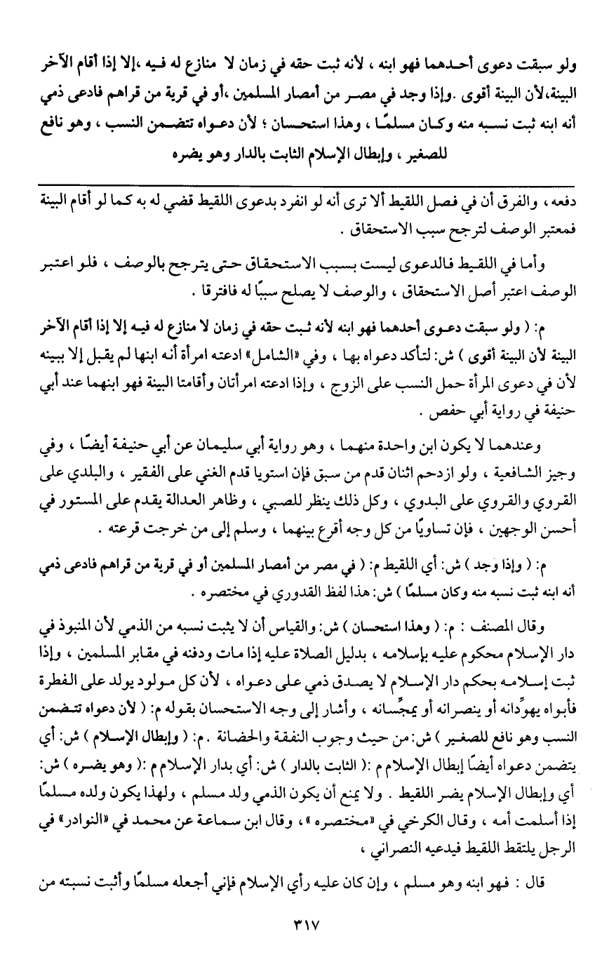 وإذا وجد في مصر من أمصار المسلمين، أو في قرية من قراهم فادعى ذمي أنه ابنه ثبت نسبه منه وكان مسلما، وهذا استحسان؛ لأن دعواه تتضمن النسب، وهو نافع للصغير، وإبطال الإسلام الثابت بالدار وهو يضره