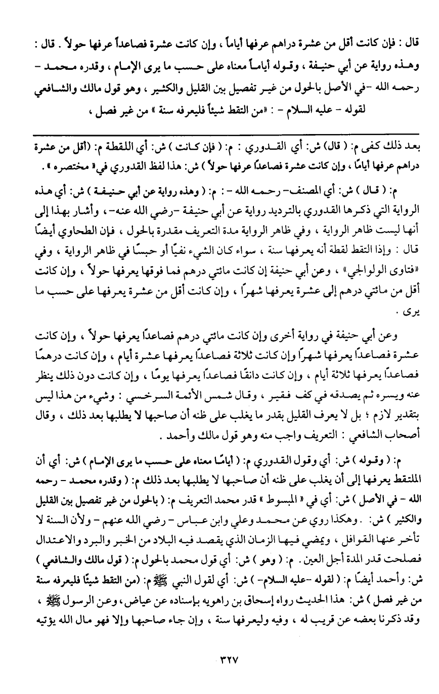 ـــــــــــــــــــــــــــــQبعد ذلك كفى م: (قال) ش: أي القدوري: م: (فإن كانت) ش: أي اللقطة م: (أقل من عشرة دراهم عرفها أياماً، وإن كانت عشرة فصاعداً عرفها حولاً) ش: هذا لفظ القدوري في " مختصره ".