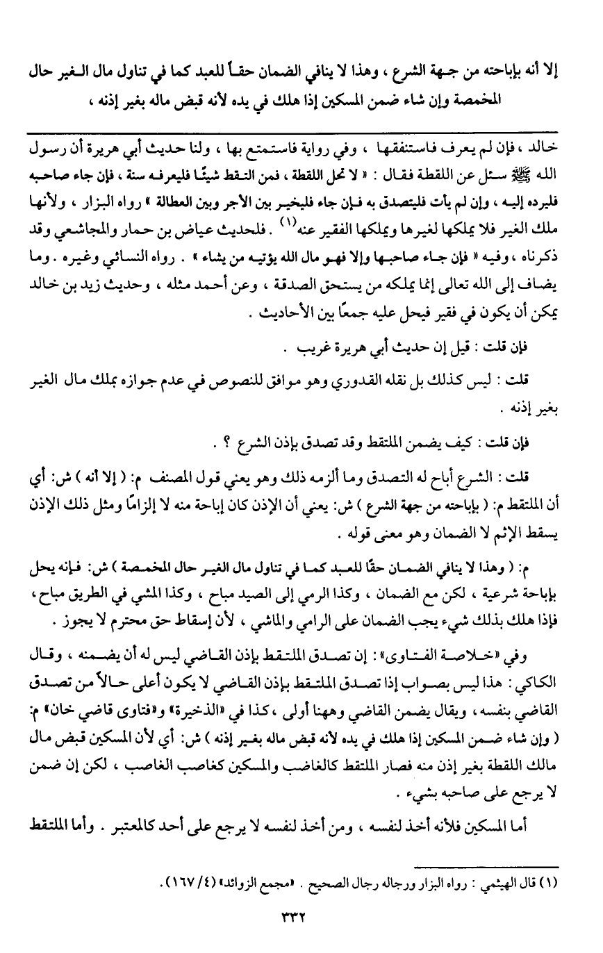 قلت: الشرع أباح له التصدق وما ألزمه ذلك وهو يعني قول المصنف م: (إلا أنه) ش: أي أن الملتقط م: (بإباحته من جهة الشرع) ش: يعني أن الإذن كان إباحة منه لا إلزاماً ومثل ذلك الإذن يسقط الإثم لا الضمان وهو معنى قوله.