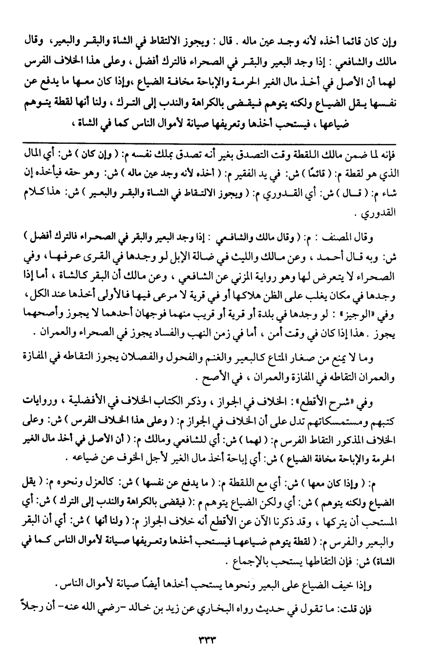 وقال المصنف: م: (وقال مالك والشافعي: إذا وجد البعير والبقر في الصحراء فالترك أفضل) ش: وبه قال أحمد، وعن مالك والليث في ضالة الإبل لو وجدها في القرى عرفها، وفي الصحراء لا يتعرض لها وهو رواية المزني عن الشافعي، وعن مالك أن البقر كالشاة، أما إذا وجدها في مكان يغلب على الظن هلاكها أو في قرية لا مرعى فيها فالأولى أخذها عند الكل، وفي " الوجيز ": لو وجدها في بلدة أو قرية أو قريب منهما فوجهان أحدهما لا يجوز وأصحهما يجوز. هذا إذا كان في وقت أمن، أما في زمن النهب والفساد يجوز في الصحراء والعمران.