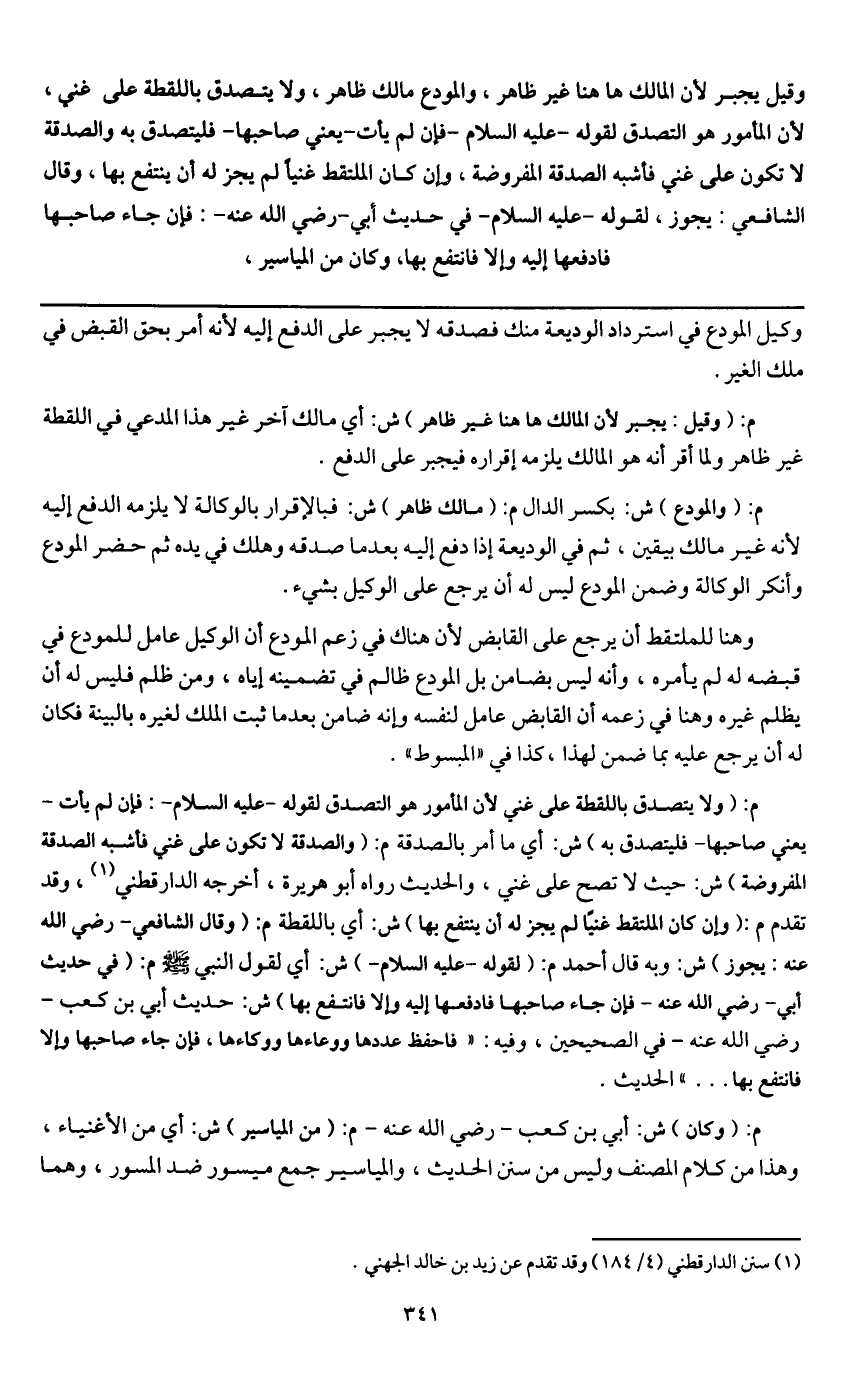 وقيل يجبر لأن المالك هاهنا غير ظاهر، والمودع مالك ظاهر، ولا يتصدق باللقطة على غني؛ لأن المأمور هو التصدق لقوله - عَلَيْهِ السَّلَامُ - «فإن لم يأت - يعني صاحبها - فليتصدق به» والصدقة لا تكون على غني فأشبه الصدقة المفروضة، وإن كان الملتقط غنيا لم يجز له أن ينتفع بها، وقال الشافعي: يجوز، لقوله - عَلَيْهِ السَّلَامُ - في حديث أبي - رَضِيَ اللَّهُ عَنْهُ -: «فإن جاء صاحبها فادفعها إليه وإلا فانتفع بها» وكان من المياسير،