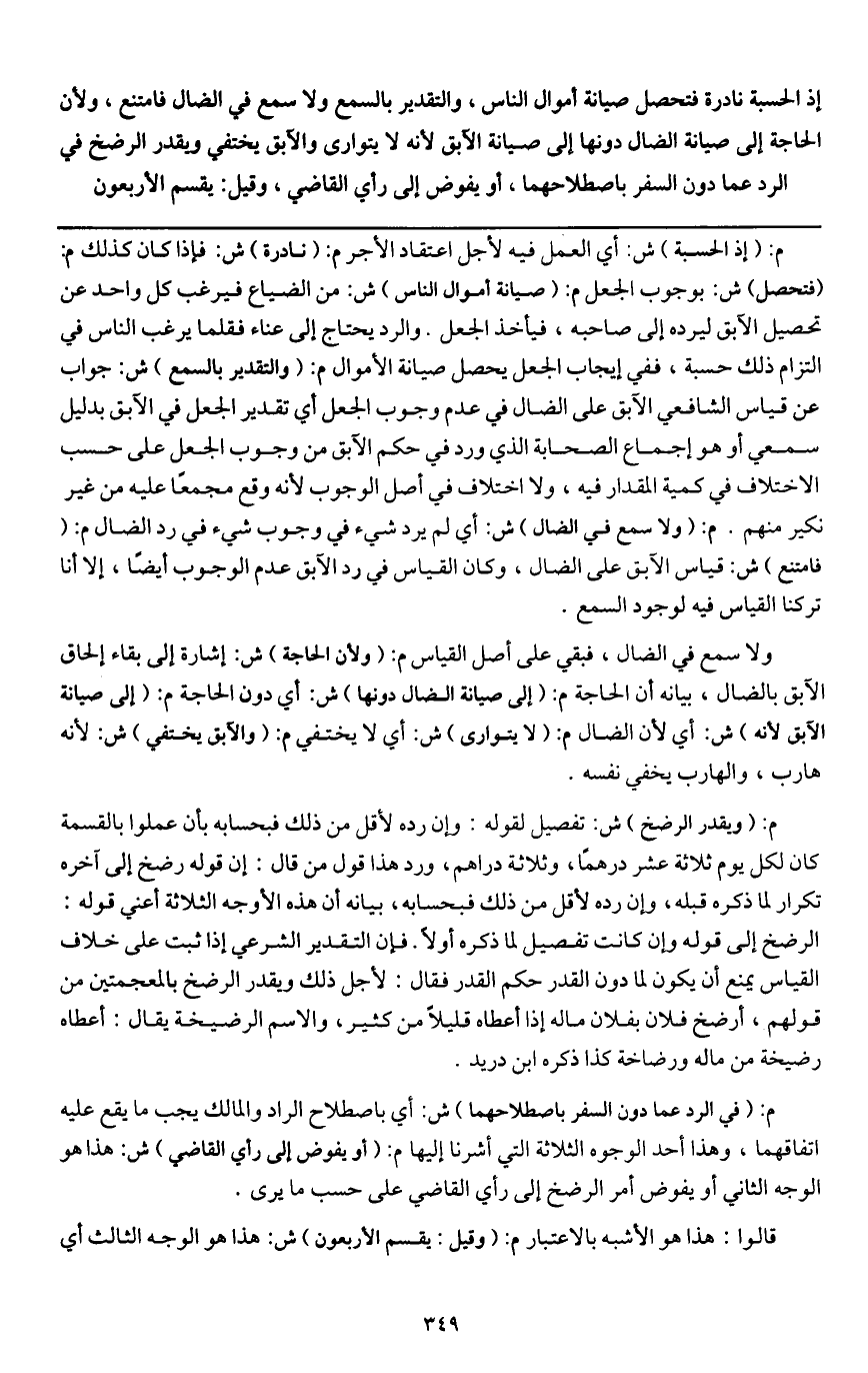 إذ الحسبة نادرة فتحصل صيانة أموال الناس، والتقدير بالسمع ولا سمع في الضال فامتنع، ولأن الحاجة إلى صيانة الضال دونها إلى صيانة الآبق؛ لأنه لا يتوارى، والآبق يختفي، ويقدر الرضخ في الرد عما دون السفر باصطلاحهما، أو يفوض إلى رأي القاضي، وقيل: يقسم الأربعون.