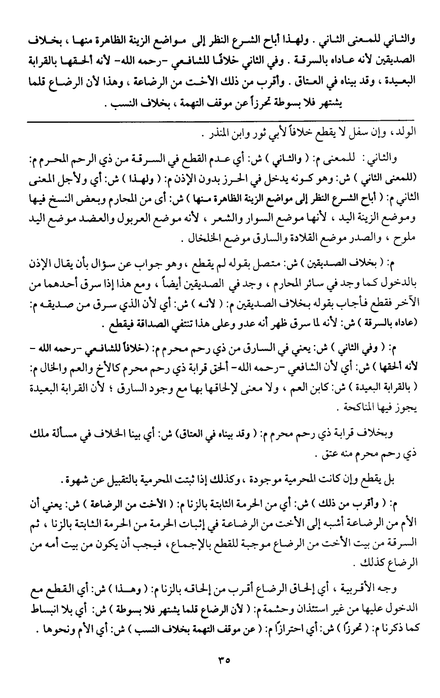 والثاني: للمعنى م: (والثاني) ش: أي عدم القطع في السرقة من ذي الرحم المحرم م: (للمعنى الثاني) ش: وهو كونه يدخل في الحرز بدون الإذن م: (ولهذا) ش: أي ولأجل المعنى الثاني م: (أباح الشرع النظر إلى مواضع الزينة الظاهرة منها) ش: أي من المحارم وبعض النسخ فيها وموضع الزينة اليد؛ لأنها موضع السوار والشعر؛ لأنه موضع العربول والعضد موضع اليد ملوح، والصدر موضع القلادة والسارق موضع الخلخال.