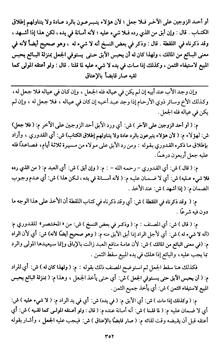 م: (أو أحد الزوجين على الآخر) ش: أي ورد الآبق أحد الزوجين على الآخر م: (فلا جعل) ش: لهؤلاء م: (لأن هؤلاء يتبرعون بالرد عادة ولا يتناولهم إطلاق الكتاب) ش: أي القدوري، وأراد بإطلاق ما ذكره القدوري بقوله: ومن رد الآبق على مولاه من مسيرة ثلاثة أيام، فصاعداً فله عليه جعل أربعون درهماً.