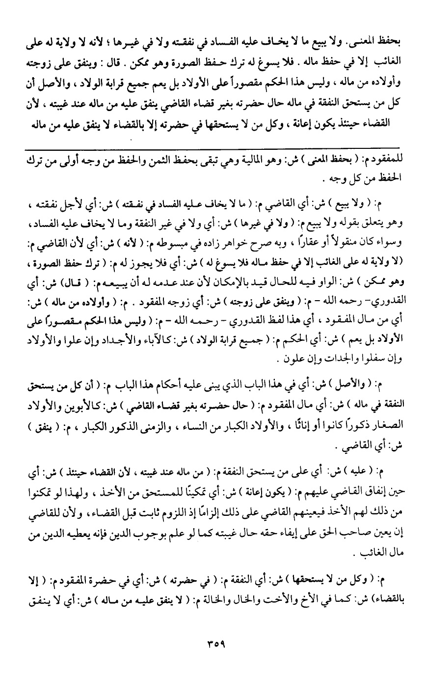 بحفظ المعنى. ولا يبيع ما لا يخاف عليه الفساد في نفقته ولا في غيرها؛ لأنه لا ولاية له على الغائب إلا في حفظ ماله. فلا يسوغ له ترك حفظ الصورة وهو ممكن. قال: وينفق على زوجته وأولاده من ماله، وليس هذا الحكم مقصورا على الأولاد بل يعم جميع قرابة الولاد، والأصل أن كل من يستحق النفقة في ماله حال حضرته بغير قضاء القاضي ينفق عليه من ماله عند غيبته؛ لأن القضاء حينئذ يكون إعانة، وكل من لا يستحقها في حضرته إلا بالقضاء لا ينفق عليه من ماله