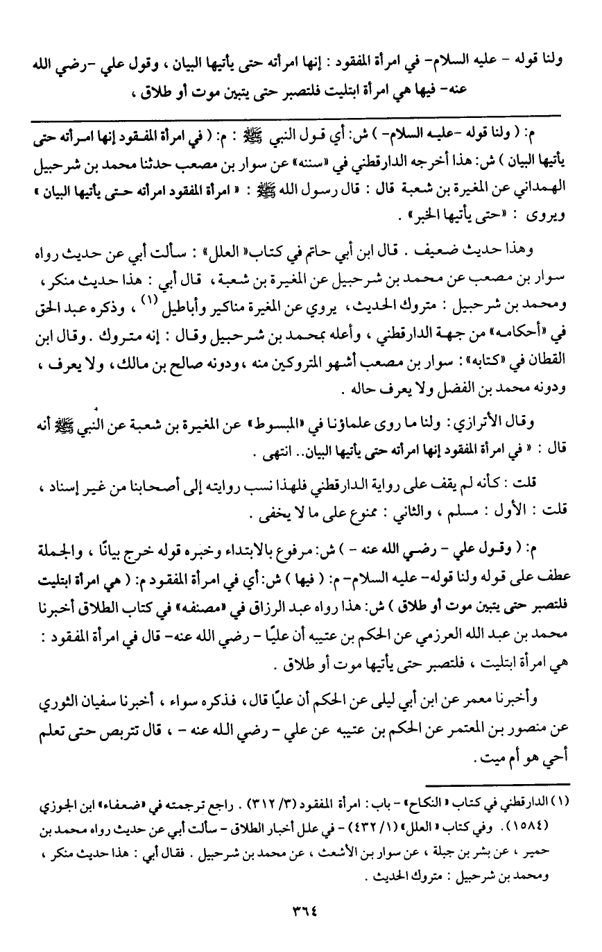 ـــــــــــــــــــــــــــــQم: (ولنا قوله - عَلَيْهِ السَّلَامُ -) ش: أي قول النبي - صَلَّى اللَّهُ عَلَيْهِ وَسَلَّمَ -: م: (في امرأة المفقود إنها «امرأته حتى يأتيها البيان» ش: هذا أخرجه الدارقطني في " سننه " عن سوار بن مصعب حدثنا محمد بن شرحبيل الهمداني عن المغيرة بن شعبة قال: قال رسول الله - صَلَّى اللَّهُ عَلَيْهِ وَسَلَّمَ -: «امرأة المفقود امرأته حتى يأتيها البيان» ويروى: «حتى يأتيها الخبر» .