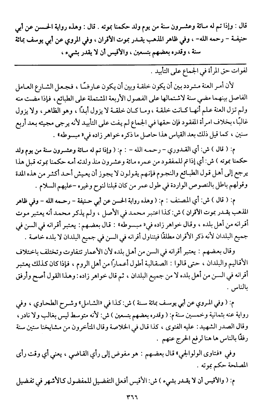 قال: وإذا تم له مائة وعشرون سنة من يوم ولد حكمنا بموته. قال: وهذه رواية الحسن عن أبي حنيفة - رَحِمَهُ اللَّهُ -، وفي ظاهر المذهب يقدر بموت الأقران، وفي المروي عن أبي يوسف بمائة سنة، وقدره بعضهم بتسعين، والأقيس أن لا يقدر بشيء،
